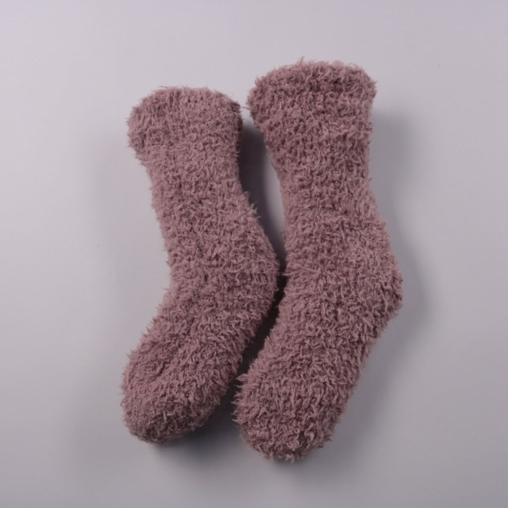 Тёплые пушистые носки без бренда в розово-фиолетовом цвете с белой манжетой. Подойдут для дома и прохладных вечеров, хорошо сохраняют тепло. Мягкая махровая фактура приятна к коже и быстро согревает ноги.
