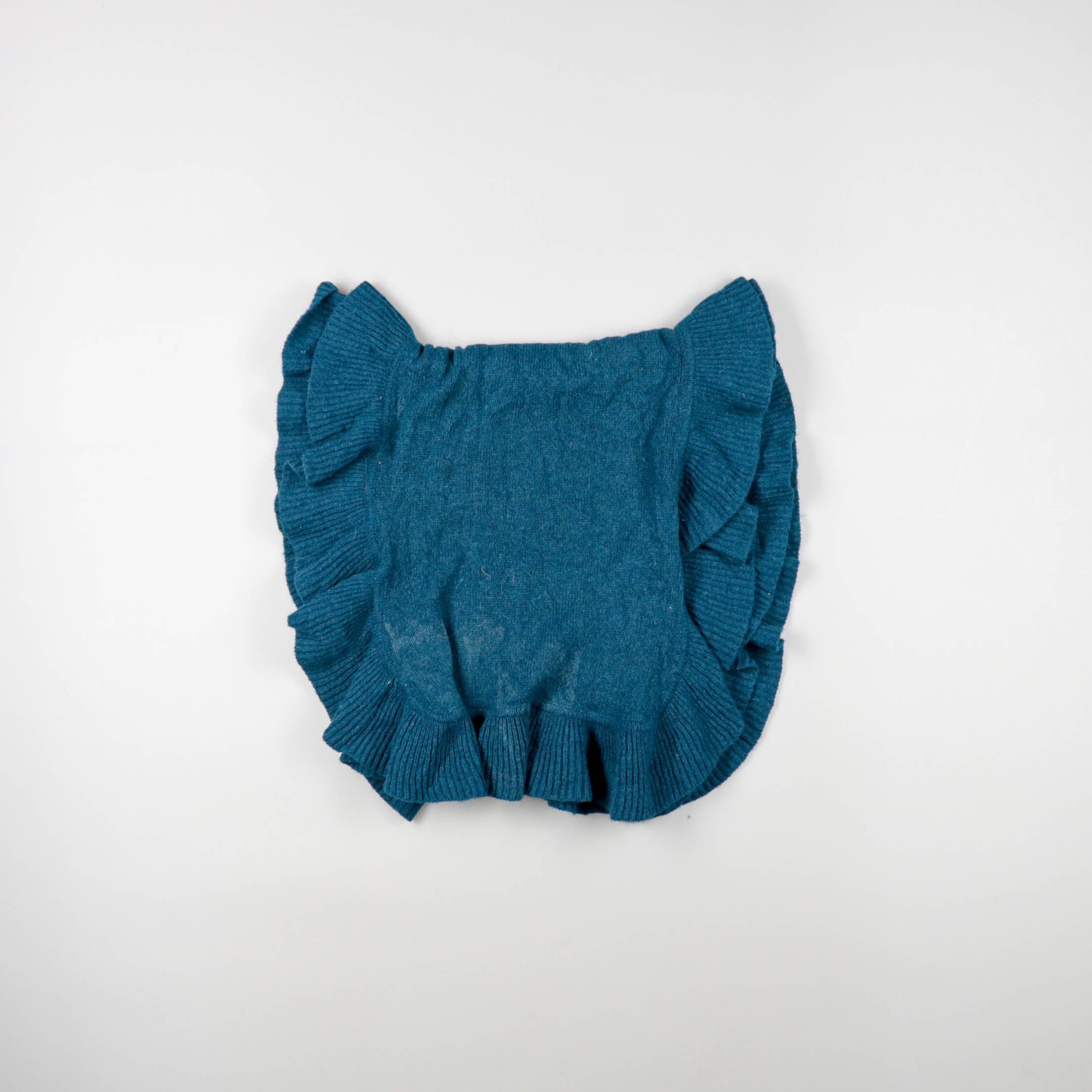 Вязаный шарф с оборками по краям в насыщенном сине-зелёном оттенке. Подойдёт для прохладной погоды осенью и весной и легко сочетается с пальто или курткой. Мягкий материал приятно лежит на шее и добавляет образу фактуру.