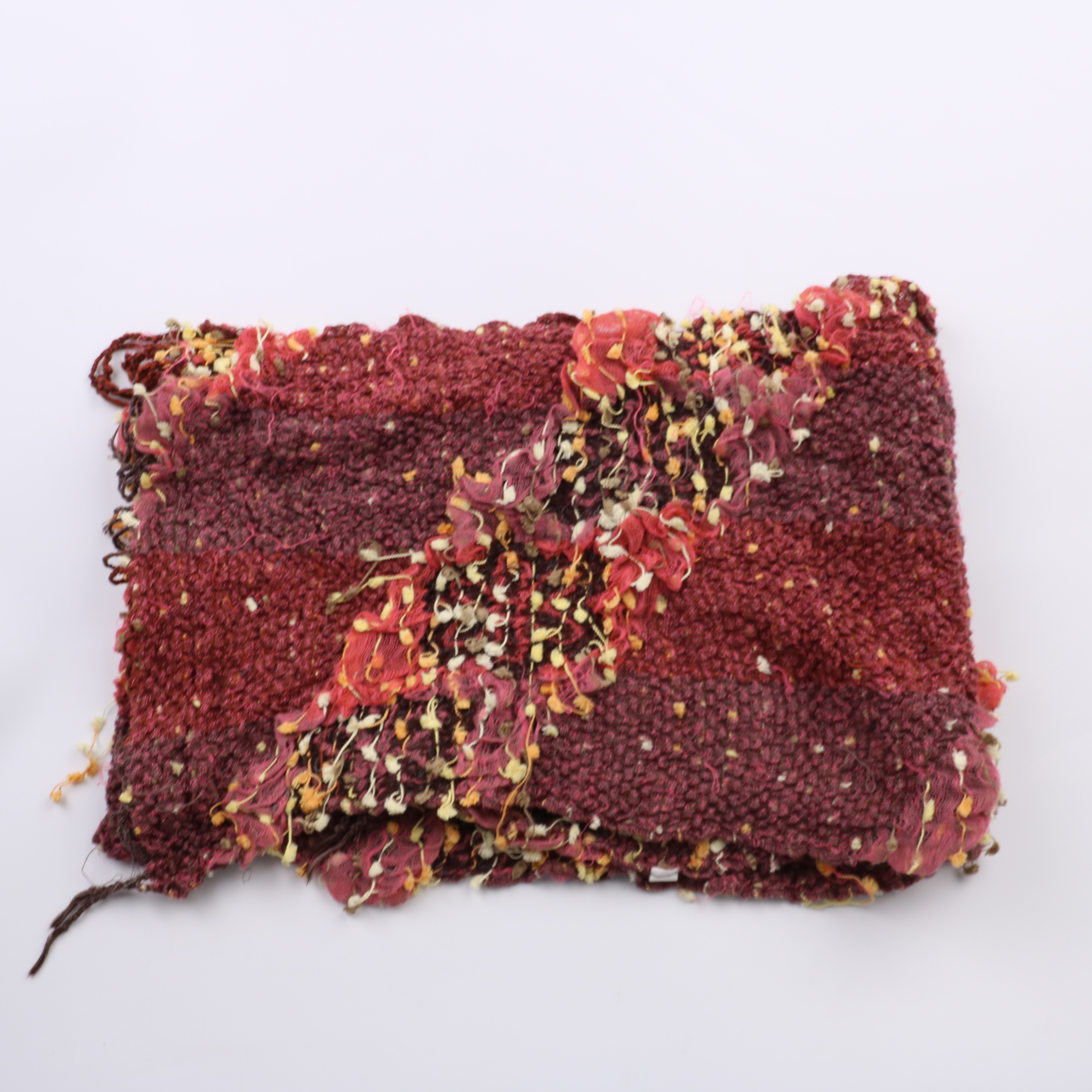 Вязаный шарф-снуд в бордово-красной гамме с фактурной пряжей и декоративными вкраплениями. Подойдёт для прохладной осени и весны, хорошо смотрится с пальто, курткой или жакетом. Удобно носить как хомут — не развязывается и быстро надевается.