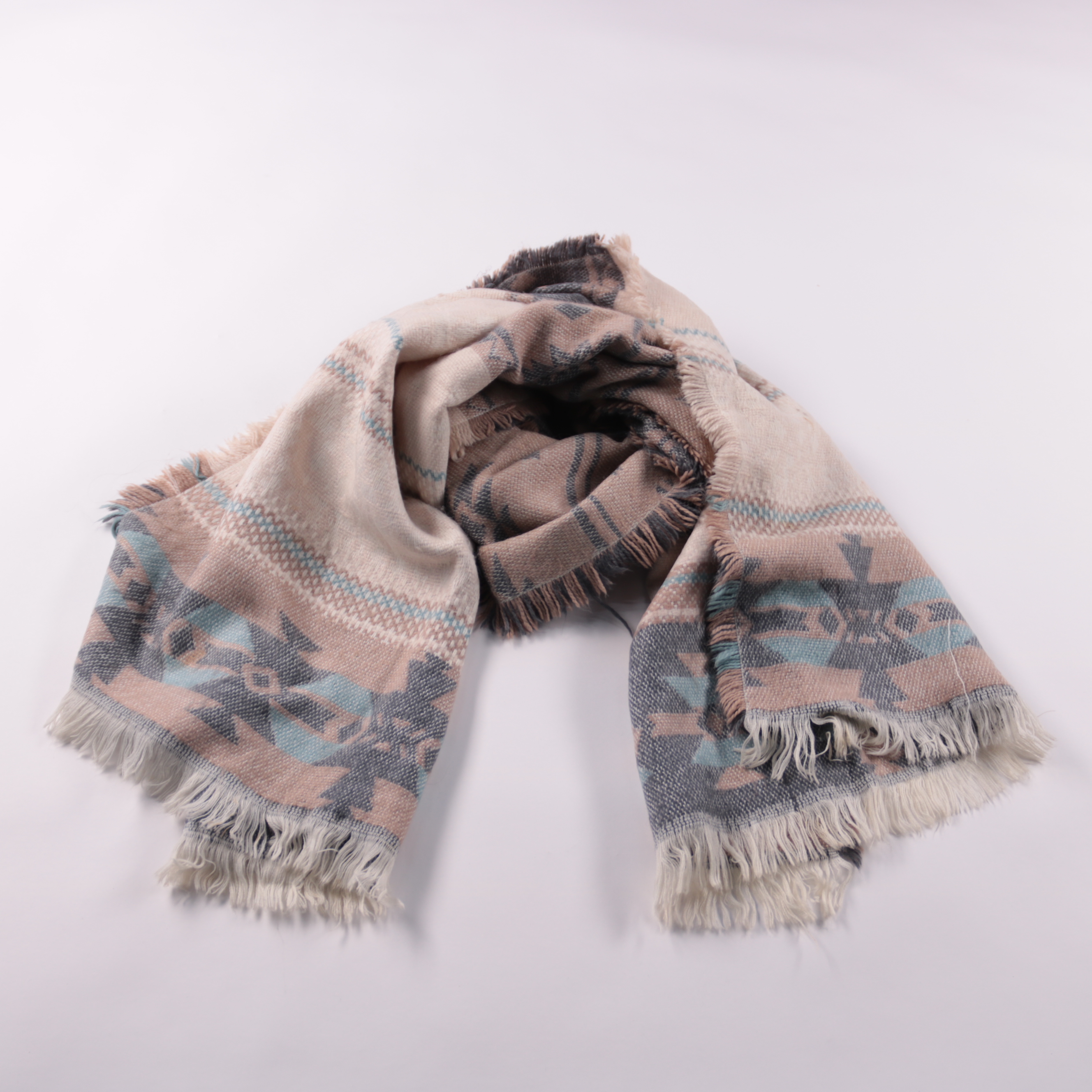 Шарф с бахромой и геометрическим узором в спокойной бежево-серо-голубой гамме. Подойдёт на прохладную погоду для повседневных образов и поездок. Мягко драпируется и хорошо защищает шею от ветра.