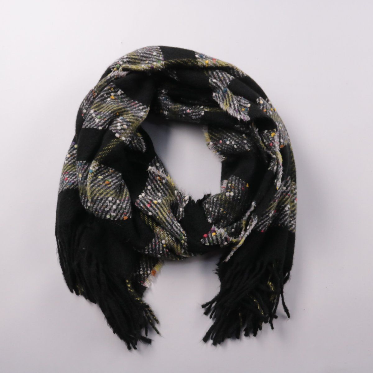 Шарф с бахромой и узором в клетку на чёрном фоне, без указания бренда. Подойдёт для повседневных образов в прохладную погоду и как акцент к однотонной верхней одежде. Акриловый состав делает его лёгким в уходе и быстро сохнущим.