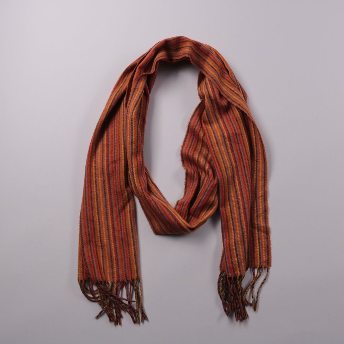 Шарф в полоску с кисточками, без указания бренда. Подойдёт для повседневных образов в прохладную погоду и в межсезонье. Легко сочетать с однотонной верхней одеждой, а длина позволяет завязывать разными способами.