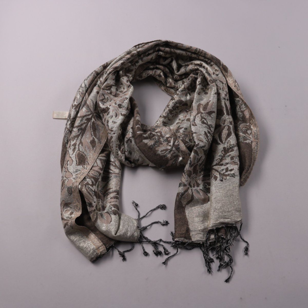 Шарф с цветочным жаккардовым рисунком и кисточками по краю, без указанного бренда. Подойдёт для повседневных образов и как накидка на плечи в прохладную погоду. Легко сочетать с базовой одеждой благодаря спокойной гамме.