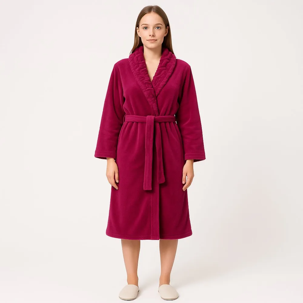 Домашний халат Floozie из мягкого флиса, с поясом и объёмным воротником. Подойдёт для дома после душа или в прохладные вечера. Практичный материал быстро сохнет и не требует сложного ухода.
