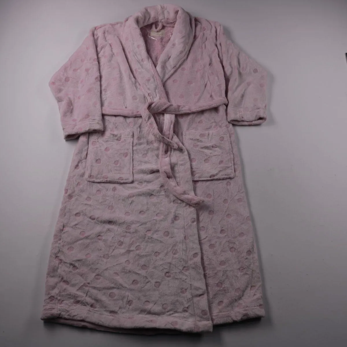 Мягкий домашний халат M&S нежно‑розового цвета в горошек, с шалевым воротником, поясом и накладными карманами. Подойдёт для дома, после душа или бани, когда хочется быстро согреться. Материал из 100% полиэстера прост в уходе и быстро сохнет.