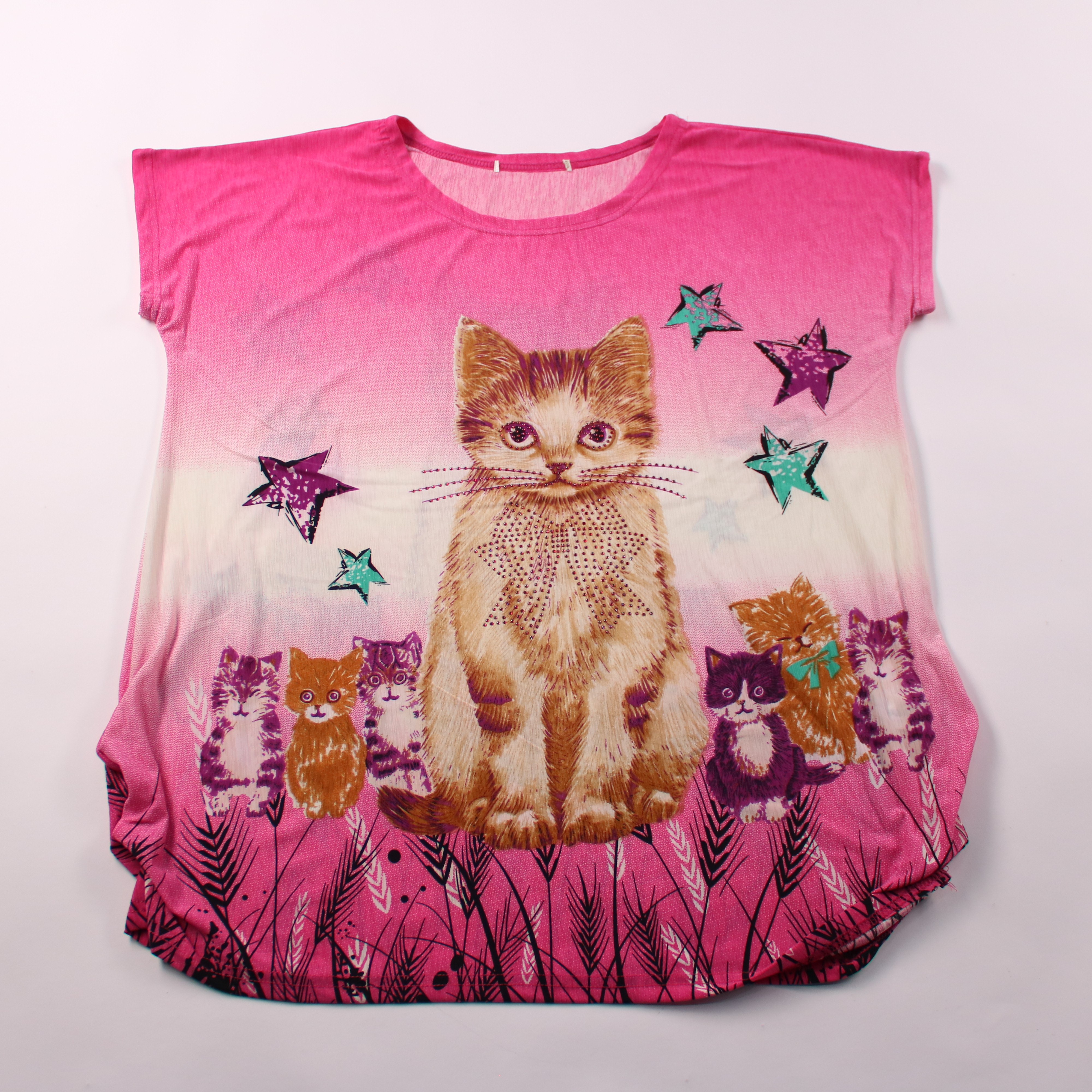 Футболка Made in P.R.C. розового цвета с ярким принтом котят и звёзд. Подойдёт для летних прогулок и повседневной носки. Лёгкая ткань быстро сохнет после стирки.