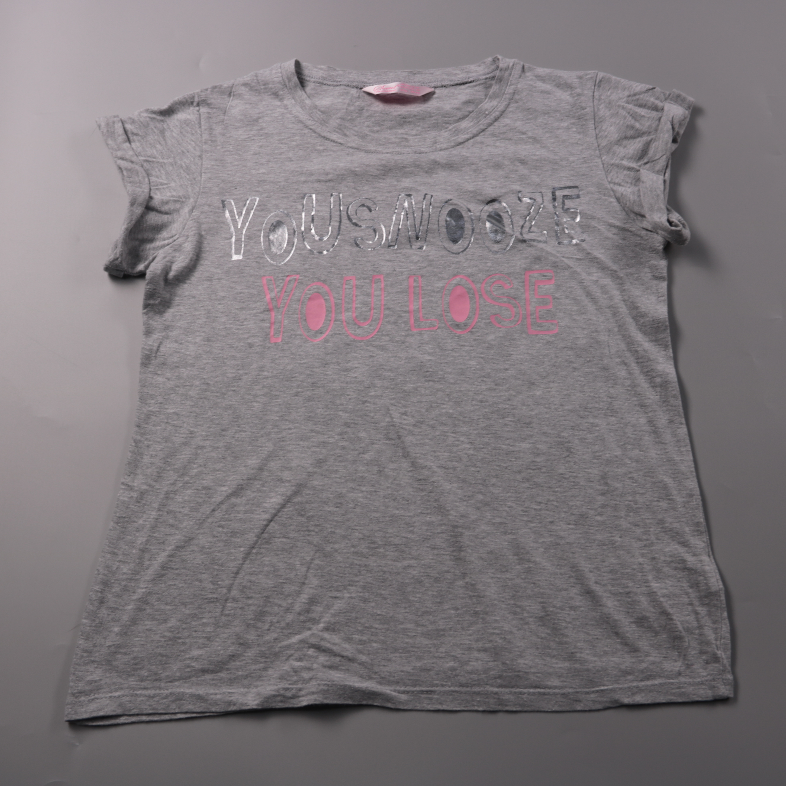 Футболка Sweet серого меланжа с надписью «You Snooze You Lose» и короткими рукавами с небольшими сборками. Подойдёт для школы, прогулок и повседневной носки в тёплое время или как слой под кофту. Ткань хлопковая с добавлением полиэстера, легко стираетс...