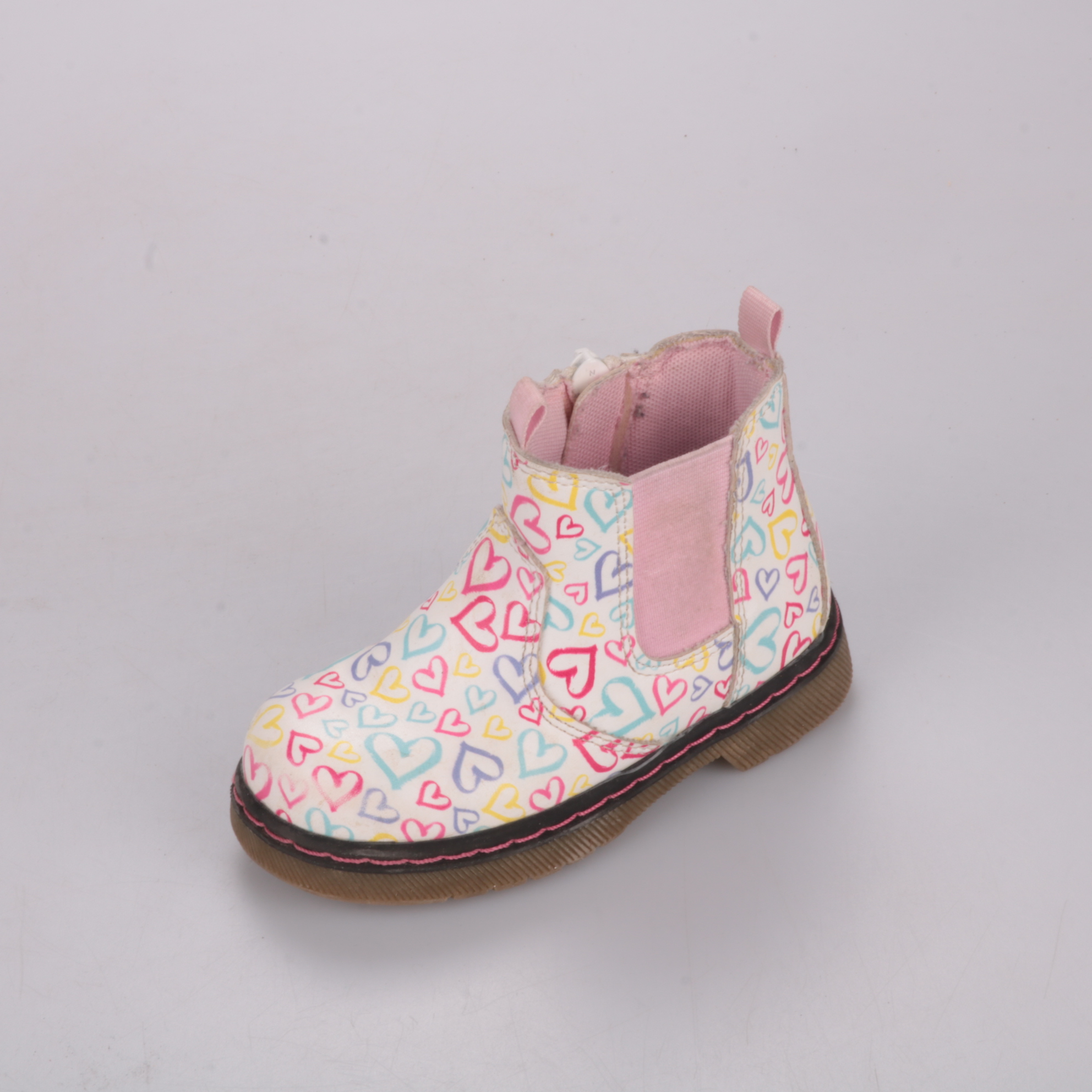 Детские демисезонные ботинки с принтом сердечки и боковой молнией для удобного надевания. Подойдут для прогулок в прохладную погоду весной и осенью. Рифлёная подошва помогает меньше скользить на улице.