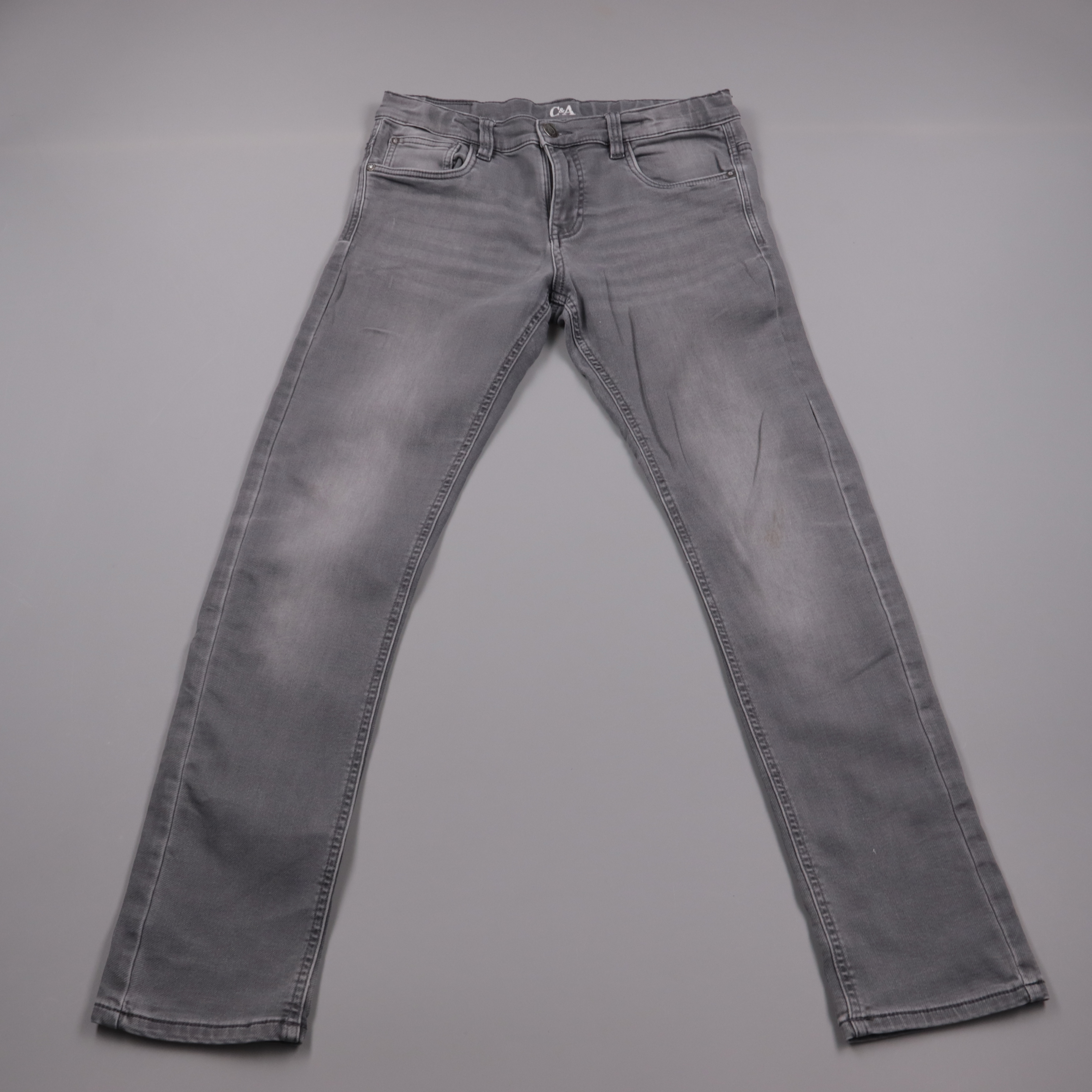 Джинсы C&A серого цвета, прямой посадки с классическими 5 карманами. Подойдут мальчику на каждый день в школу или на прогулки благодаря спокойному цвету и удобному крою. Плотный деним со стрейчем хорошо тянется и не сковывает движения.
