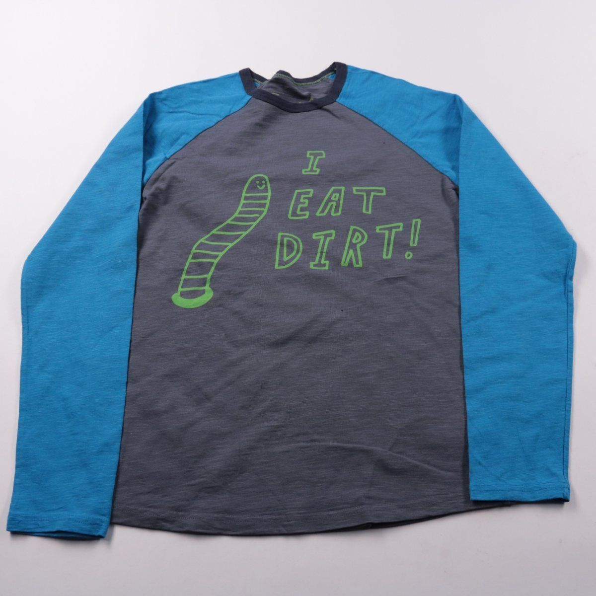 Лонгслив Johnnie B из 100% хлопка, серый с голубыми рукавами реглан и принтом «I EAT DIRT!». Подойдёт для повседневной носки и активных прогулок в любое время года. Хлопковая ткань дышит и комфортна в течение дня.