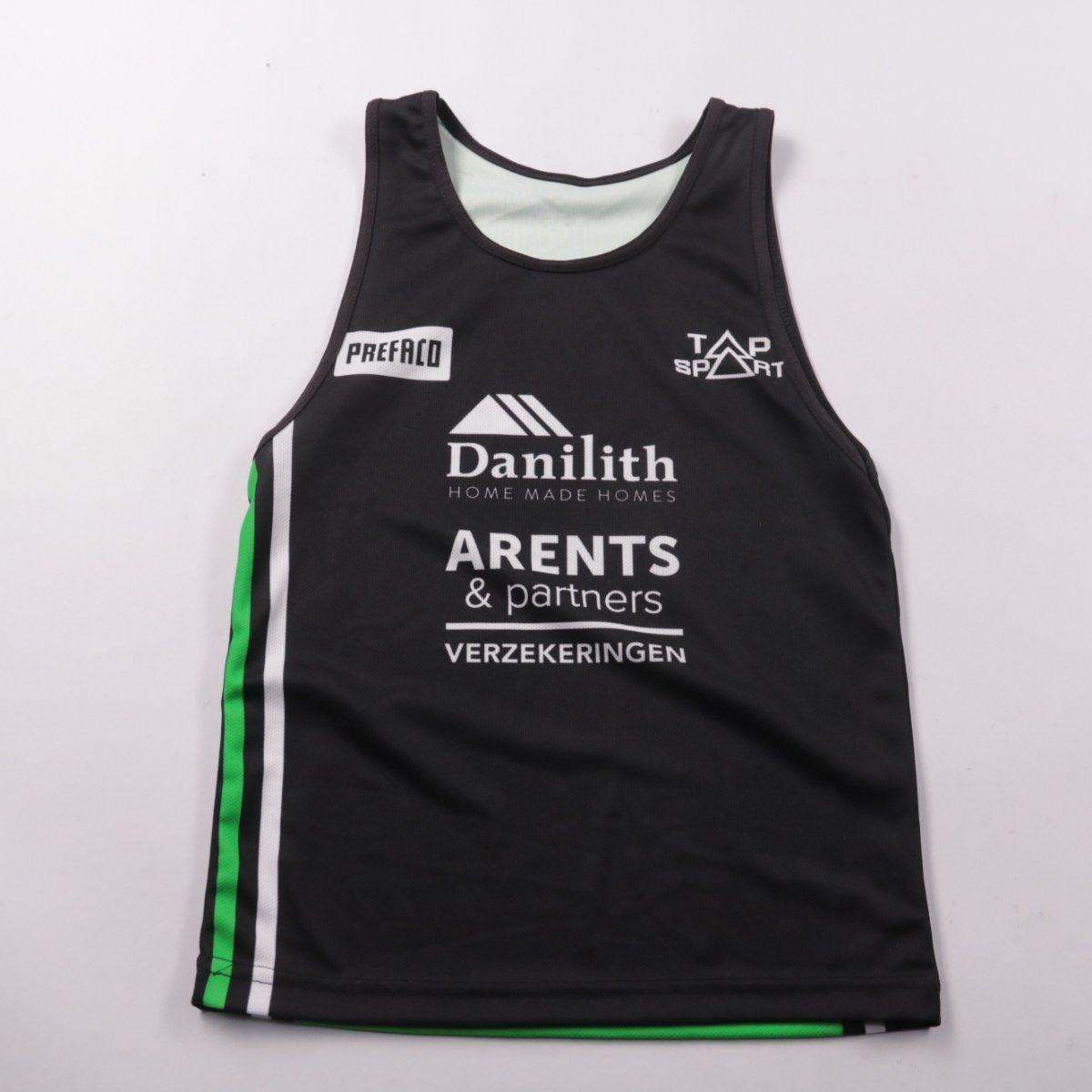 Спортивная майка TAP SPORT с двусторонним дизайном (чёрная сторона с принтами и зелёная с надписью VITA Atletiekclub). Подойдёт для тренировок и соревнований в тёплую погоду, хорошо сочетается со спортивными шортами. Полиэстер быстро сохнет и удобен в уходе.