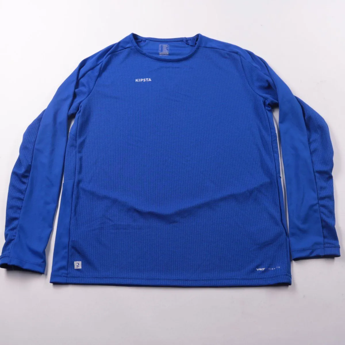 Лонгслив Kipsta (Decathlon) синего цвета из спортивного синтетического материала. Подойдёт для тренировок и активных игр в зале или на улице в прохладную погоду. Ткань быстро сохнет и удобна как базовый слой.