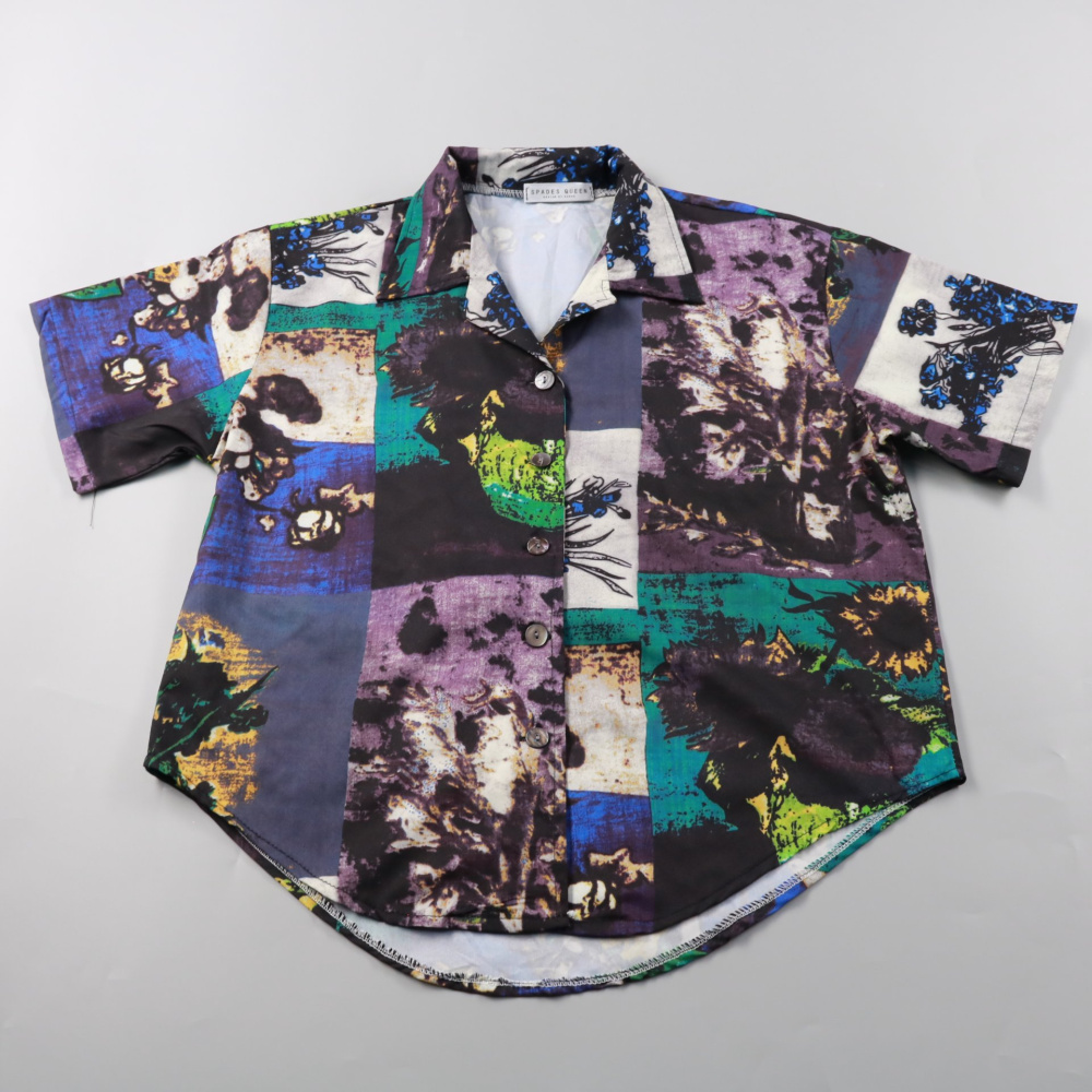 Рубашка Spades Queen для мальчика с коротким рукавом и ярким принтом в стиле пэчворк. Подойдёт для лета, прогулок и отдыха, хорошо сочетается с шортами или джинсами. Лёгкая ткань и застёжка на пуговицы делают её удобной в носке.