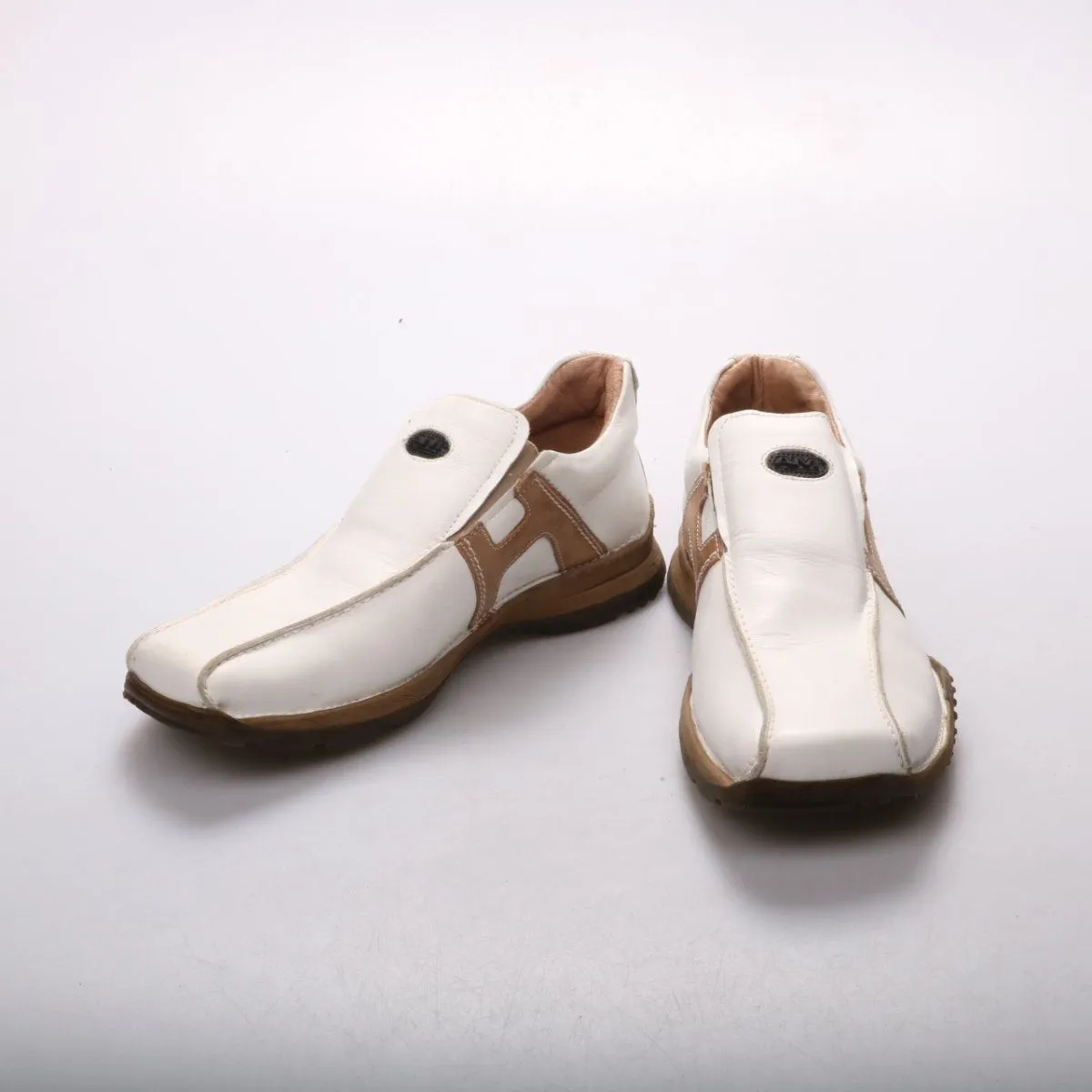 Мужские лоферы AM из белой кожи с бежевыми вставками и резиновой подошвой. Подойдут для повседневной носки в городе в тёплую весну и осень, а также летом. Удобны тем, что без шнуровки — быстро надеваются и хорошо сидят на ноге.