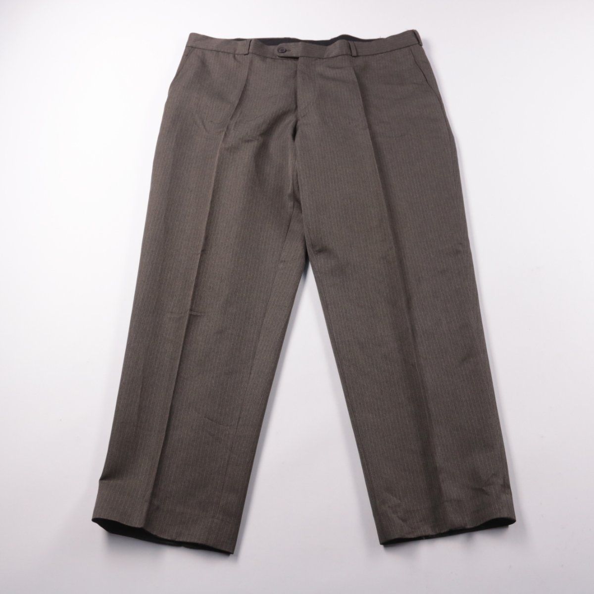 Мужские классические брюки без указанного бренда, серого цвета с тонкой фактурой и защипами спереди. Подойдут для офиса, деловых встреч и формальных образов. Практичный материал из 100% полиэстера меньше мнётся и проще в уходе.