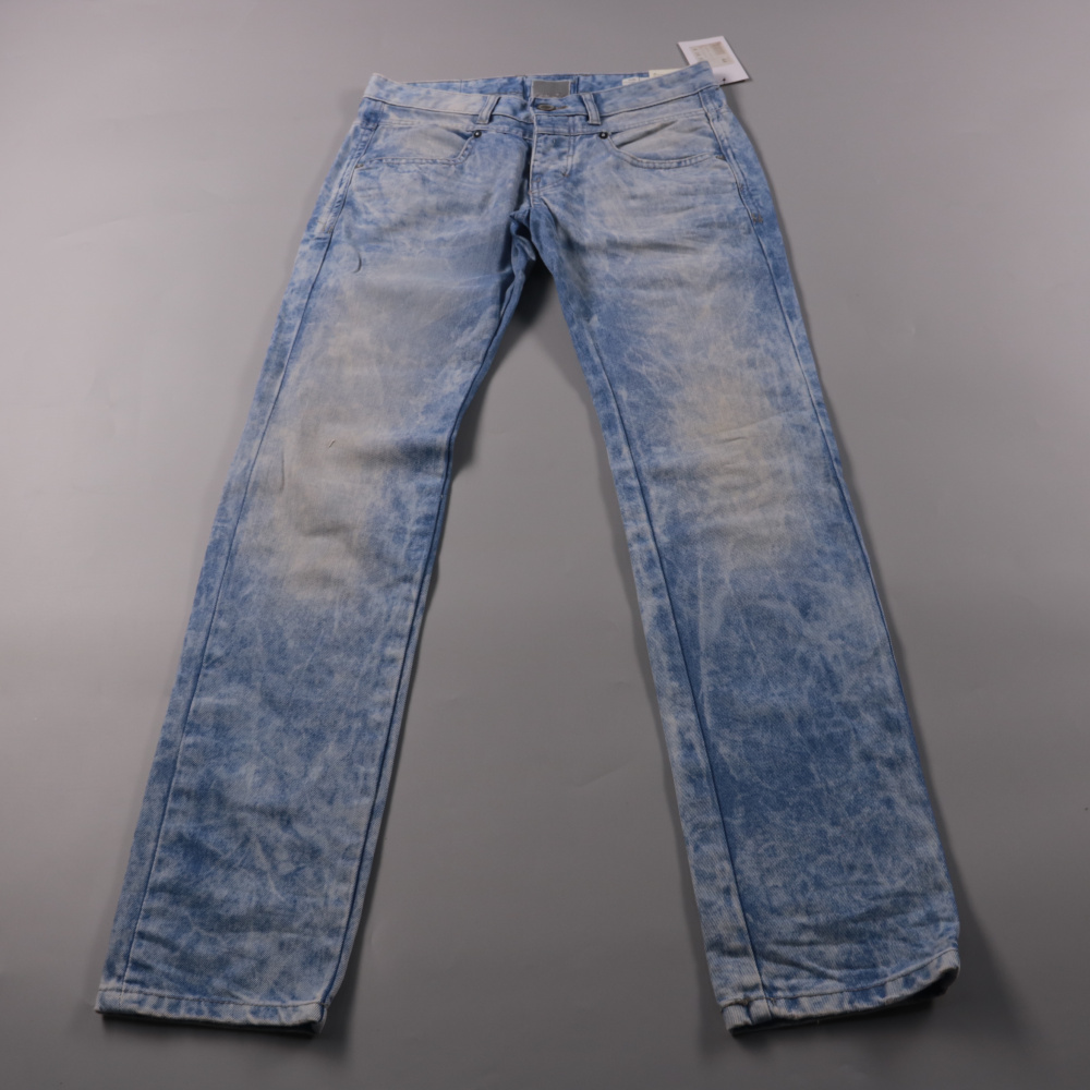 Мужские джинсы slim fit светло-синего цвета с выраженным эффектом варки. Подойдут для повседневной носки и образов в стиле casual. Плотный 100% хлопок хорошо держит форму и комфортен в носке.