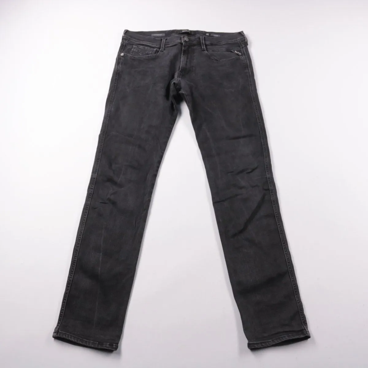 Мужские джинсы Replay Anbass в чёрном (выстиранном) дениме, размер 34. Подойдут для повседневной носки и городских образов, хорошо сочетаются с кроссовками и ботинками. Практичный тёмный цвет и прочный деним делают их удобными на каждый день.