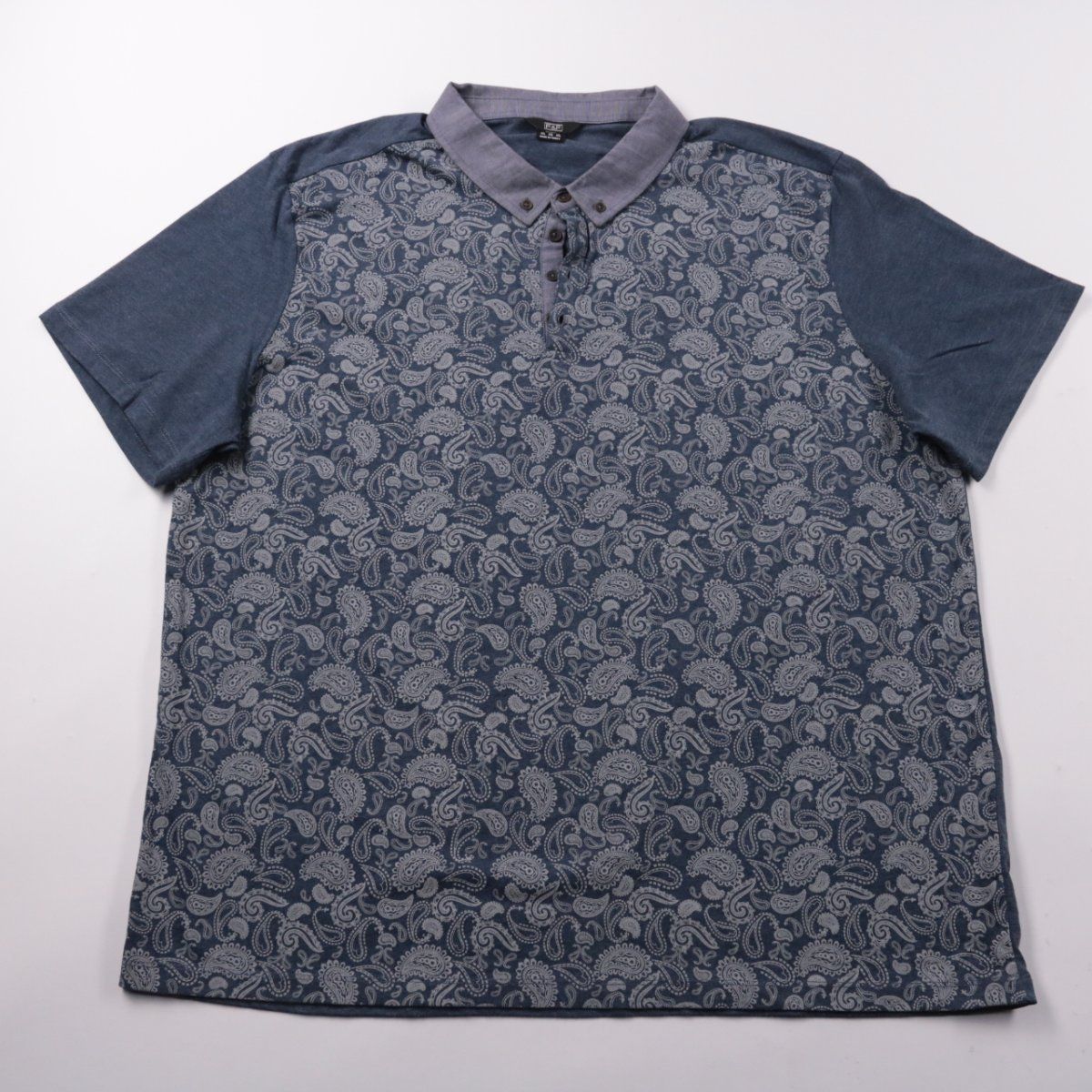 Мужское поло F&F синего цвета с принтом пейсли и воротником на пуговицах. Подойдёт для повседневной носки летом и в тёплое межсезонье под лёгкую куртку. Практичный плюс — хлопковая ткань с добавлением полиэстера легче в уходе и меньше мнётся.