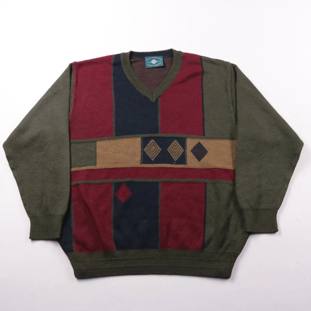 Мужской свитер John Friclay с V-образным вырезом и геометрическим узором в бордово-сине-зелёной гамме. Подойдёт для повседневной носки в прохладную погоду и для образов в стиле casual. Практичный плюс — мягкий трикотаж и эластичные манжеты с поясом, хорошо держит форму.