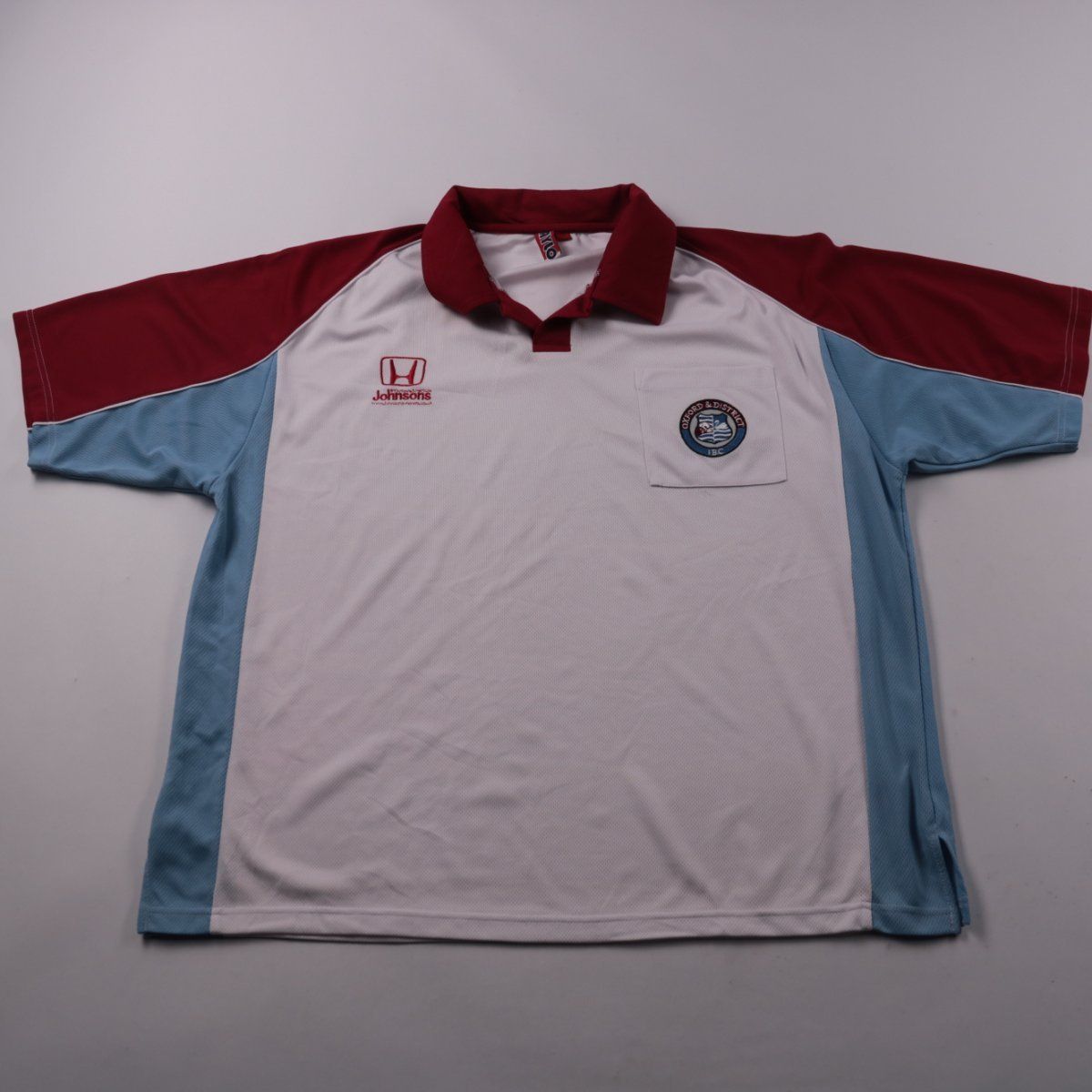 Мужское поло Onyx спортивного типа с коротким рукавом и воротником на планке. Выполнено в белом цвете с голубыми и бордовыми вставками и нашивками на груди, подойдёт для повседневной носки и активного отдыха. Лёгкий полиэстер быстро сохнет и прост в уходе.