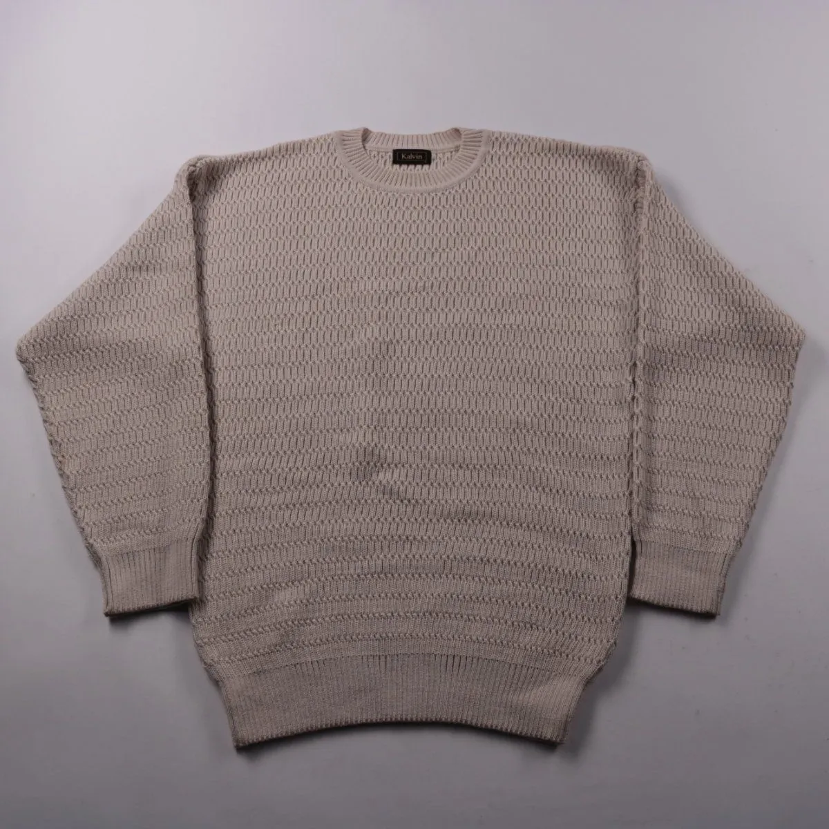 Мужской вязаный свитер Kalvin светло-бежевого цвета с фактурной вязкой и круглым вырезом. Подойдёт для повседневной носки в прохладную погоду, хорошо сочетается с джинсами и брюками. Смесь мериносовой шерсти с акрилом делает его тёплым и менее требовательным в уходе.