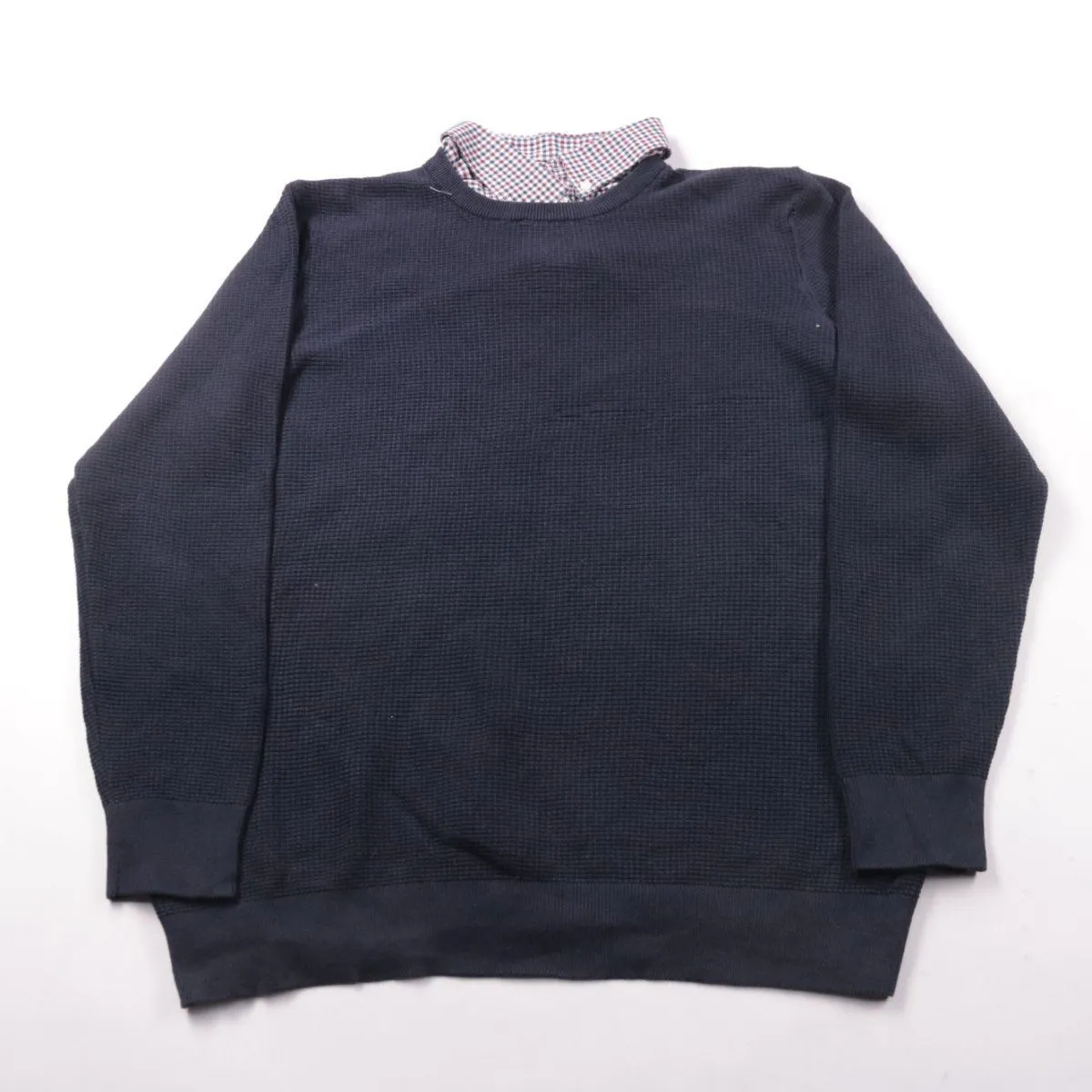 Мужской свитшот F&F тёмно-синего цвета с фактурной тканью и вставкой-воротником в клетку. Подойдёт для повседневной носки и офисного casual, хорошо смотрится с джинсами и чиносами. Практичный за счёт плотного материала и эластичных манжет/низа, держит форму.