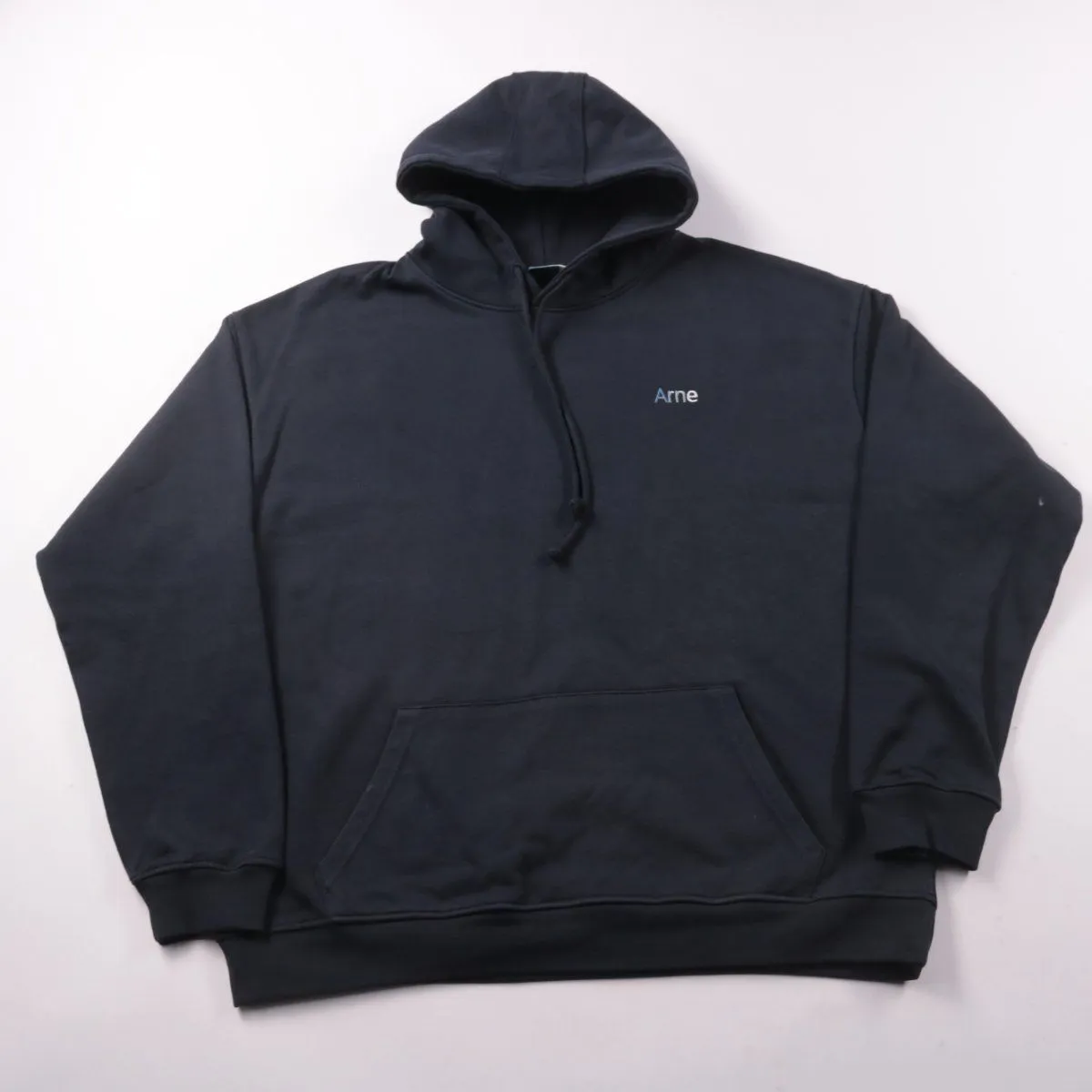 Худи ARNE чёрного цвета из плотного хлопкового футера с капюшоном и карманом-кенгуру. Подойдёт для повседневной носки и прогулок в прохладную погоду. Практичное преимущество — мягкий утеплённый материал и удобные манжеты, хорошо держит форму.