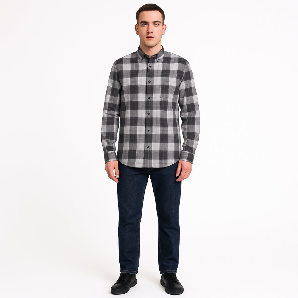 Мужская рубашка FSBN regular fit в серо-чёрную клетку, с длинным рукавом и застёжкой на пуговицы. Подойдёт для офиса в стиле casual и на каждый день, хорошо сочетается с джинсами и чиносами. Ткань easy care практична в уходе и меньше мнётся.