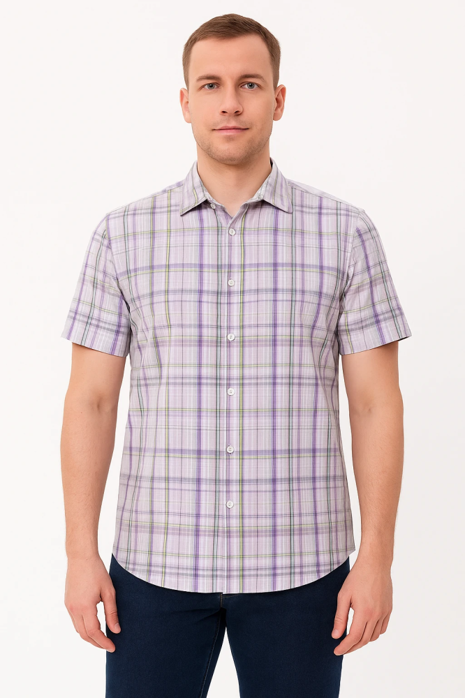 Мужская рубашка Bexleys в клетку в спокойных сиренево-серых тонах, с коротким рукавом и классическим воротником. Подойдёт для повседневных образов и офиса в тёплую погоду. Лёгкая ткань хорошо дышит и комфортно носится в течение дня.