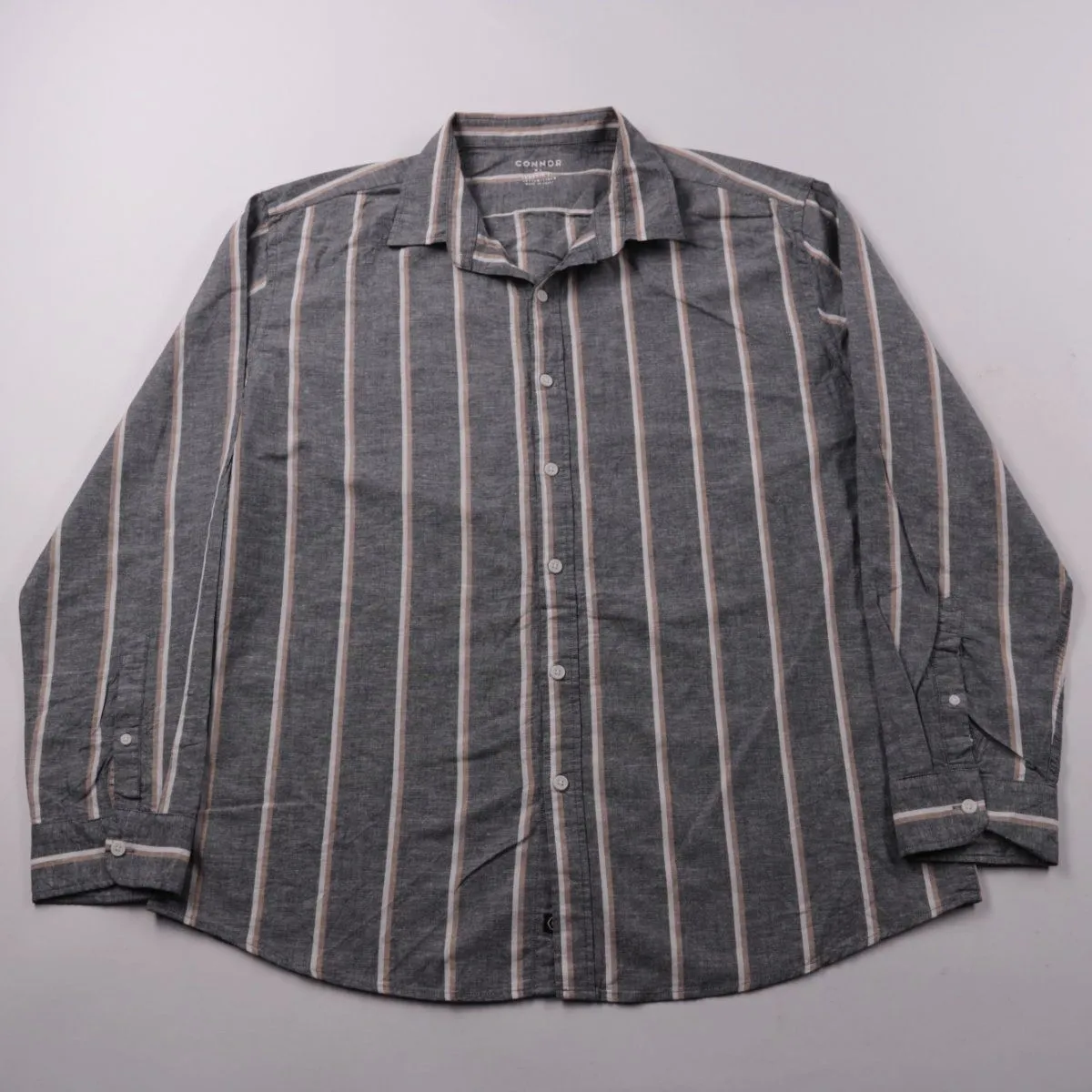 Мужская рубашка Connor в сером цвете с вертикальной полоской, застёгивается на пуговицы и с длинным рукавом. Подойдёт для повседневной носки, офиса в стиле casual или прогулок в тёплую погоду. Смесь хлопка и льна хорошо дышит и комфортна в носке.
