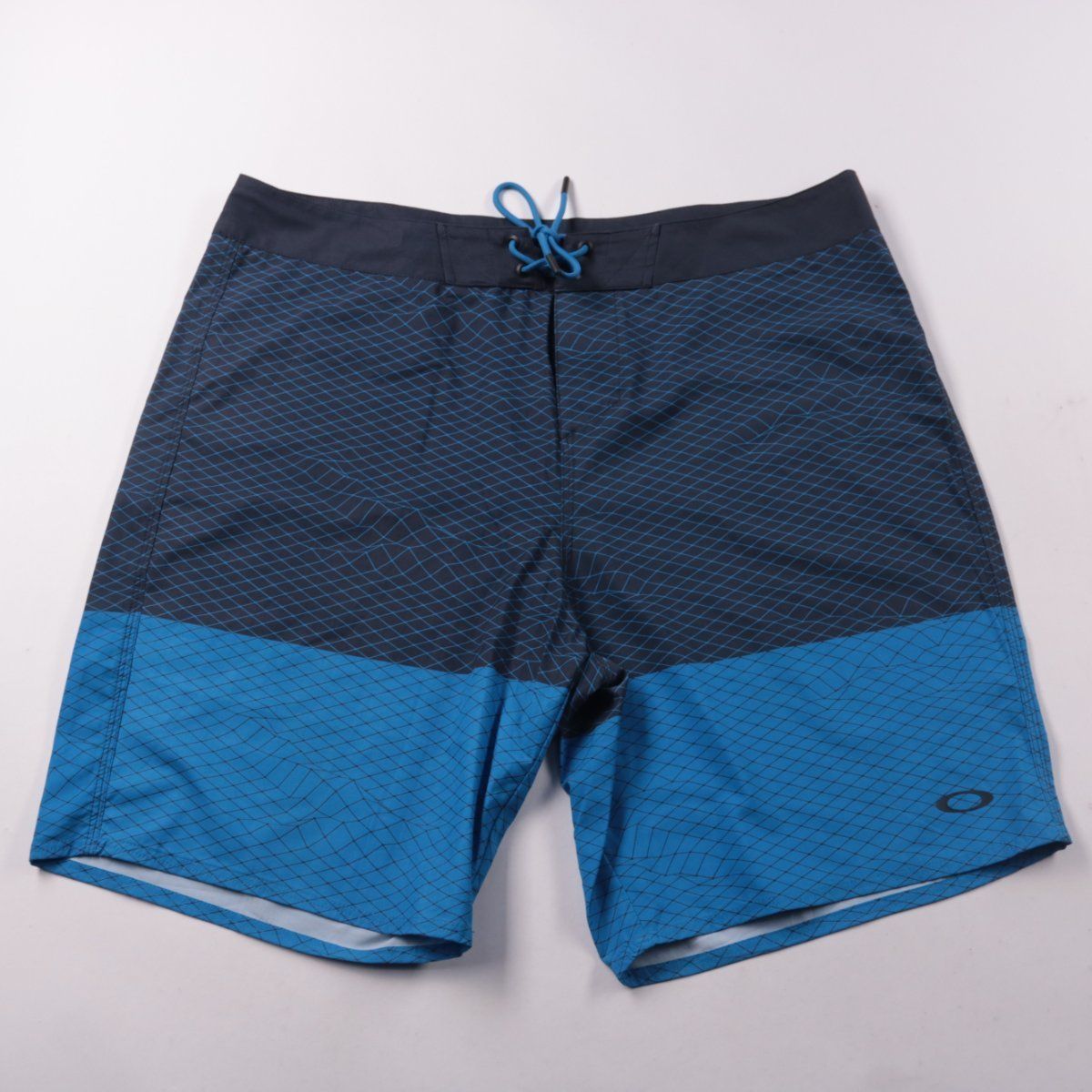 Мужские шорты Oakley в сине-голубой расцветке с геометрическим принтом и шнуровкой на поясе. Подойдут для пляжа, плавания и активного отдыха в тёплую погоду. Ткань тянется за счёт эластана и быстро сохнет.