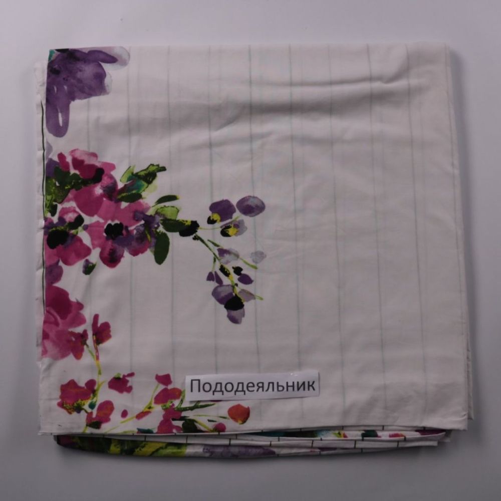 Пододеяльник с цветочным принтом в фиолетово-розовых оттенках и тонкими полосками на светлом фоне. Подойдёт для повседневного использования дома и добавит яркий акцент в спальню. Практичен в уходе и легко сочетается с однотонным постельным бельём.