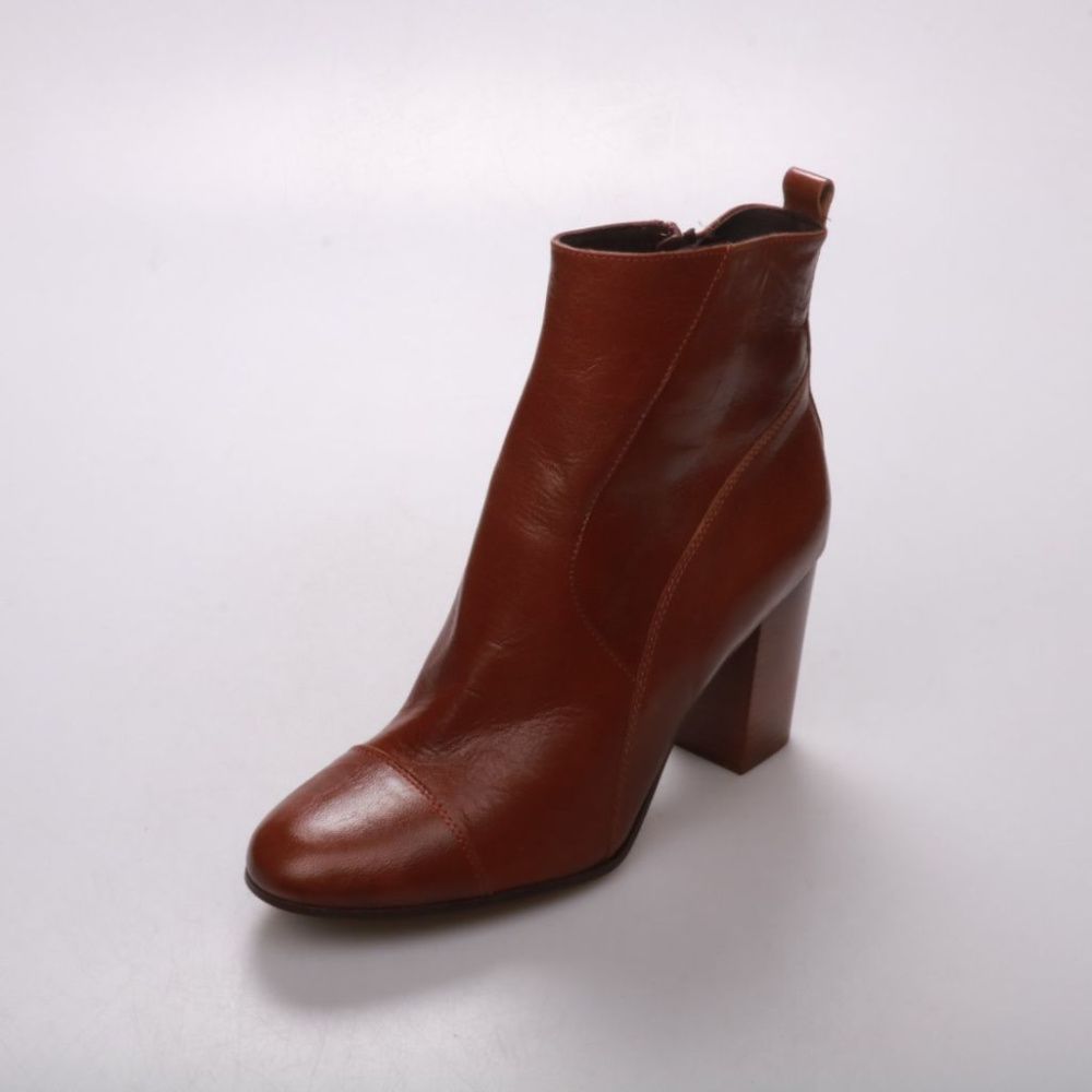 Кожаные ботильоны San Marina в коричневом цвете на устойчивом каблуке и с боковой молнией. Подойдут для повседневных и офисных образов в межсезонье, хорошо сочетаются с джинсами и платьями. Плотная кожа держит форму и каблук удобен для ходьбы.