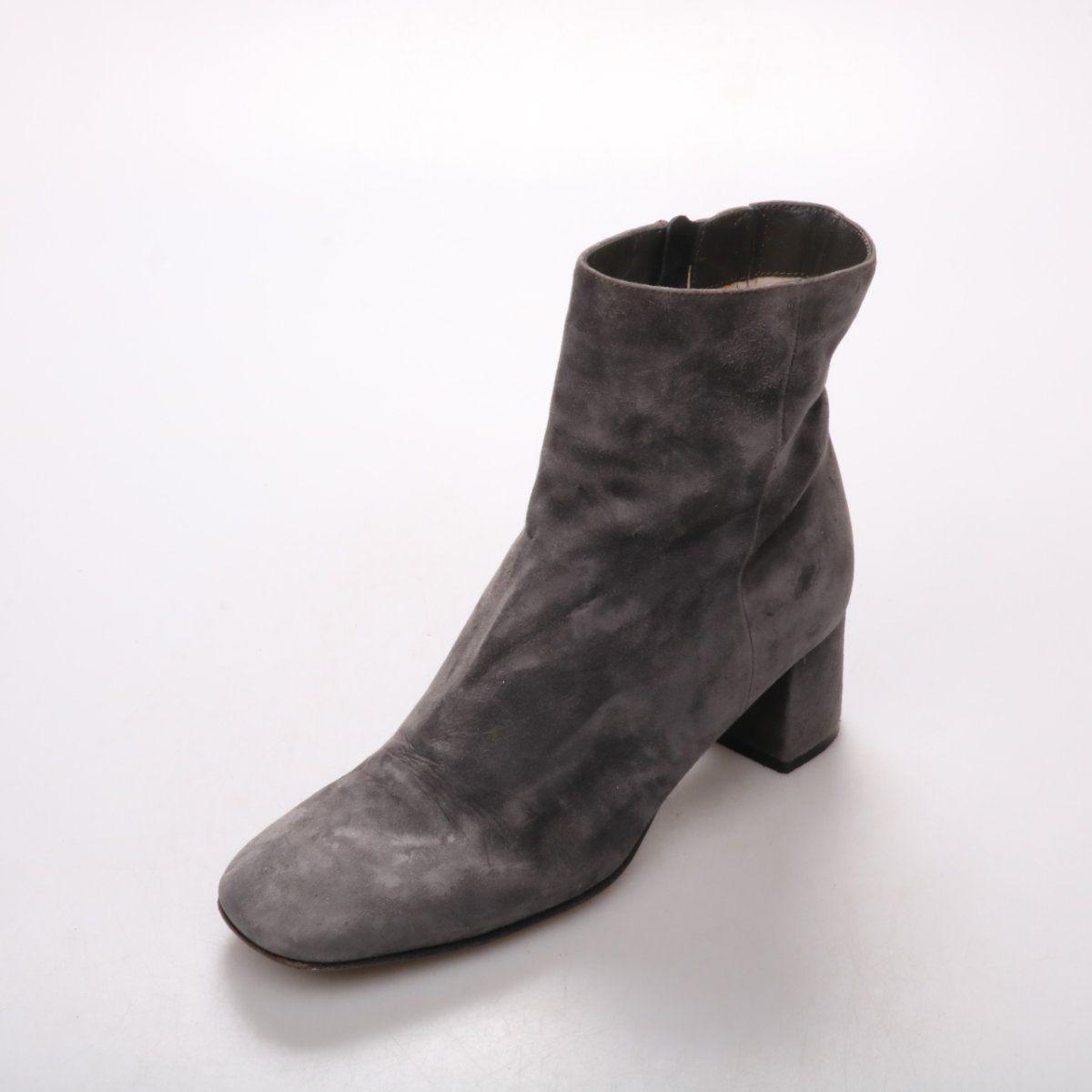 Женские серые ботильоны из натуральной замши на устойчивом каблуке, застёжка на молнию сбоку. Подойдут для повседневных образов в межсезонье с джинсами, брюками или платьями. Натуральная кожа внутри и удобный каблук делают их практичными для длительной носки.