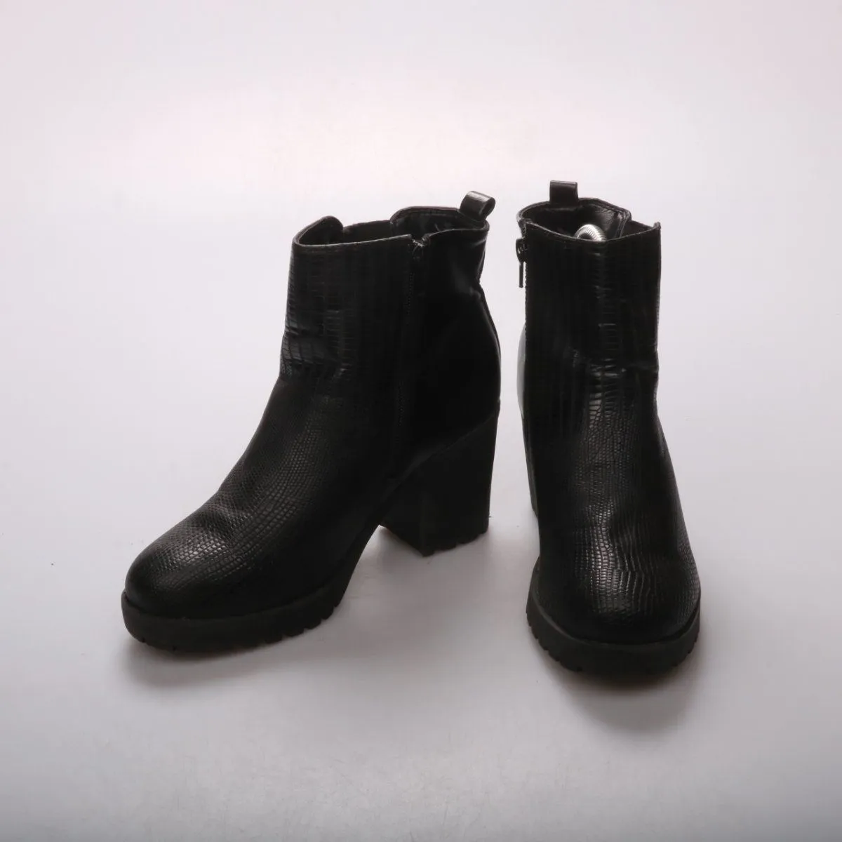Женские ботильоны из чёрной фактурной экокожи с устойчивым каблуком и боковой молнией. Подойдут для повседневных образов в межсезонье, хорошо смотрятся с джинсами и платьями. Рифлёная подошва даёт более уверенное сцепление на улице.