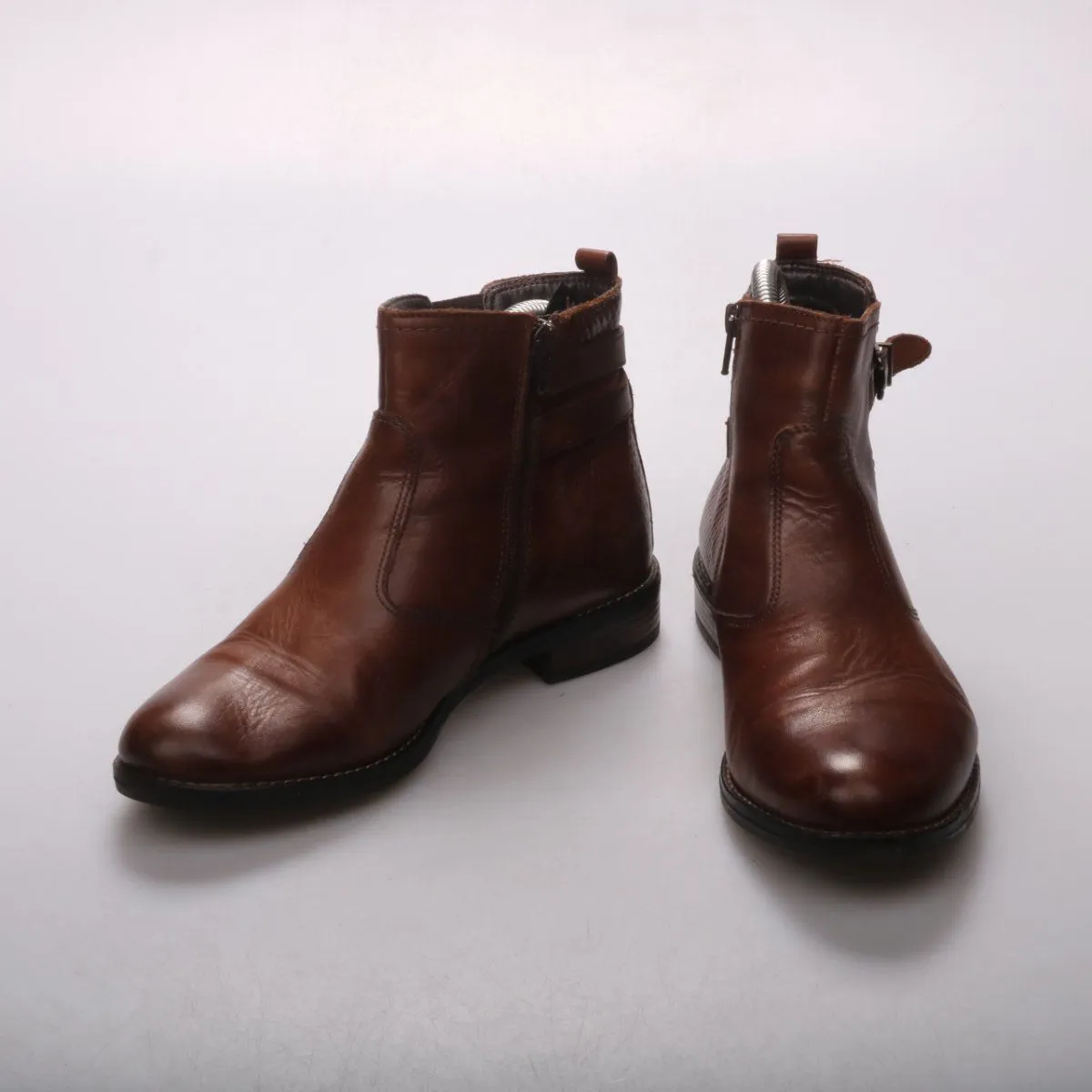 Женские ботильоны из коричневой кожи с боковой молнией и ремешком-пряжкой на щиколотке. Подойдут для повседневной носки в межсезонье и хорошо сочетаются с джинсами и платьями. Практичное преимущество — удобная посадка за счёт молнии и устойчивый невысокий каблук.