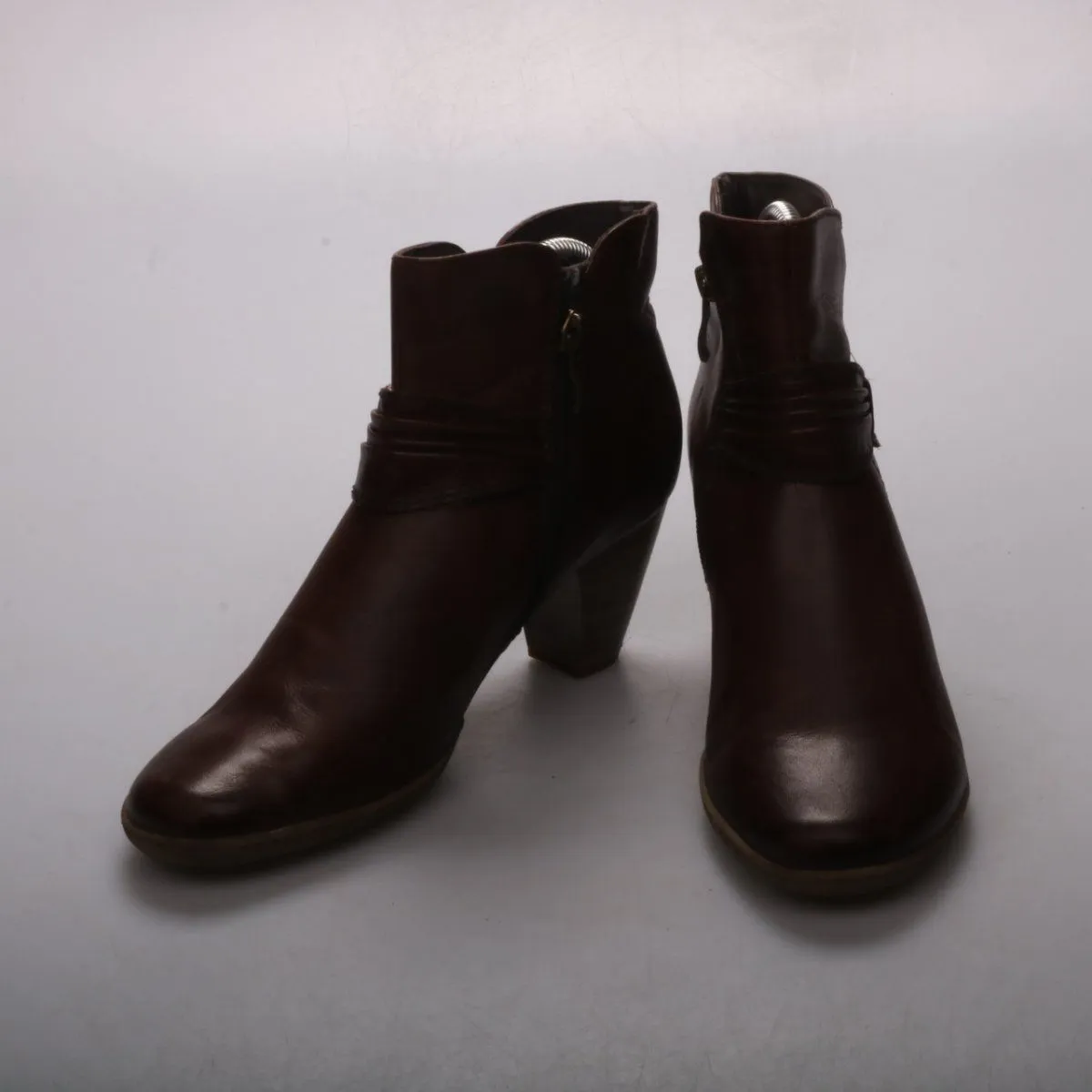 Женские ботильоны из тёмно-коричневой гладкой кожи на устойчивом каблуке, с боковой молнией и декоративным ремешком вокруг щиколотки. Подойдут для повседневной носки в городе в прохладную погоду весной и осенью. Рельефная подошва даёт более уверенное сцепление на улице.