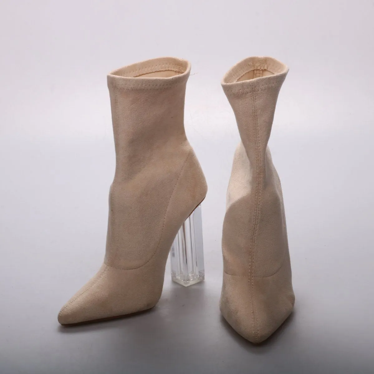 Бежевые ботильоны без застёжек с облегающим голенищем и острым носком, на прозрачном устойчивом каблуке. Подойдут для образов на выход и на каждый день в прохладную погоду. Прозрачный каблук визуально облегчает силуэт и устойчивее шпильки.