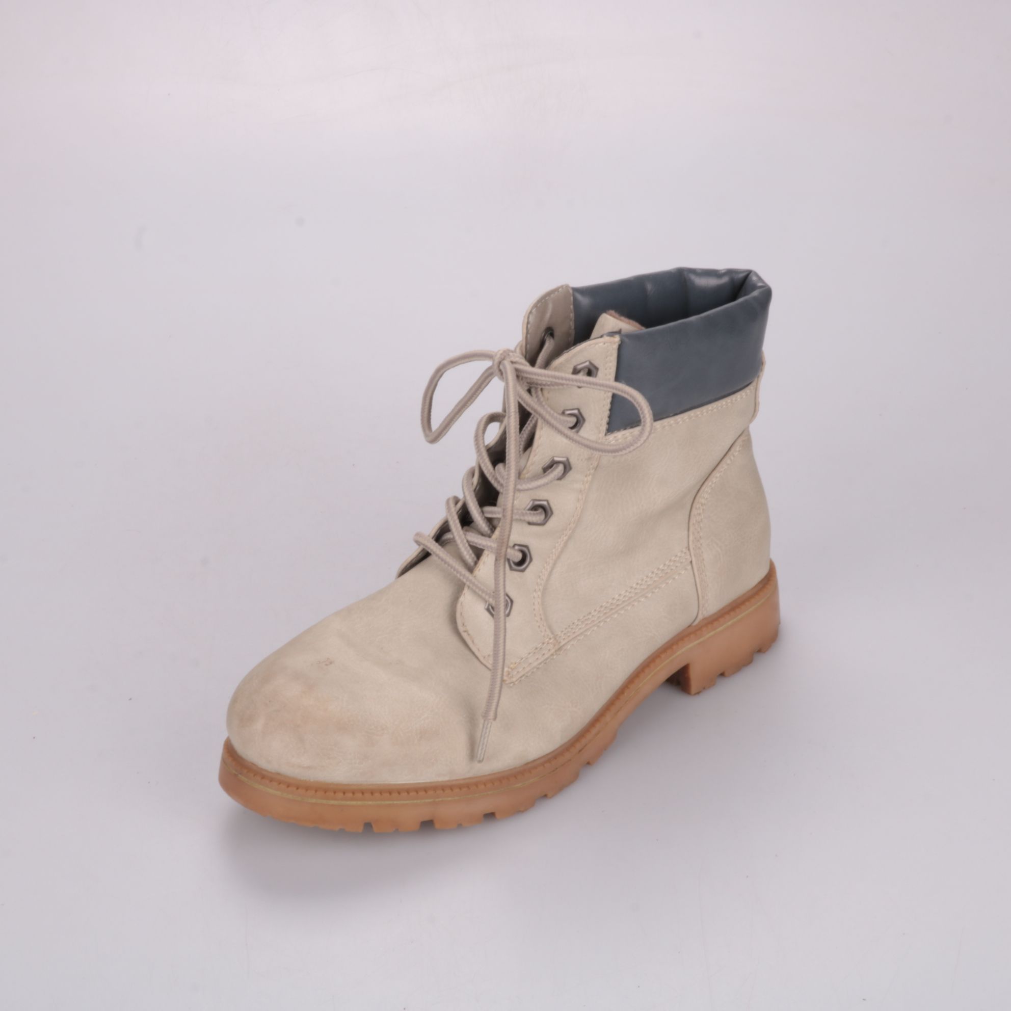 Ботинки на шнуровке в светло-бежевом цвете с мягким серым манжетом и тракторной подошвой. Подойдут на каждый день в демисезон: к джинсам, брюкам или платьям в casual-стиле. Рельефная подошва даёт хорошее сцепление и устойчивость при ходьбе.