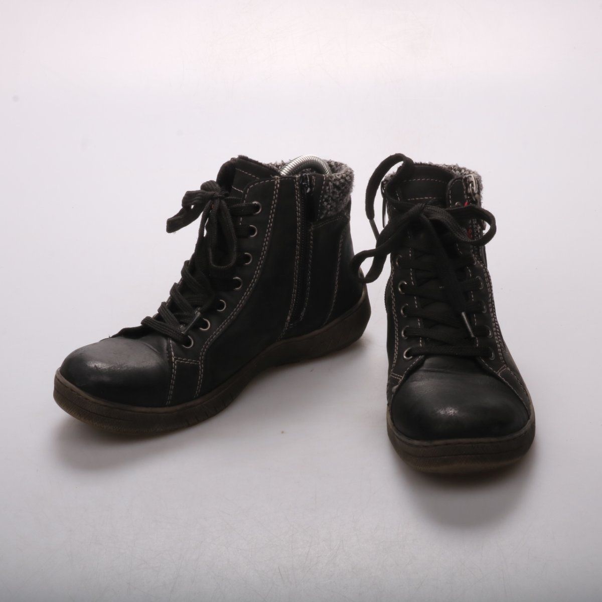 Женские чёрные ботинки на шнуровке с боковой молнией и мягким утеплённым кантом. Подойдут для повседневной носки в прохладную погоду и прогулок по городу. Практичное преимущество — удобная посадка за счёт шнуровки и быстрое надевание благодаря молнии.