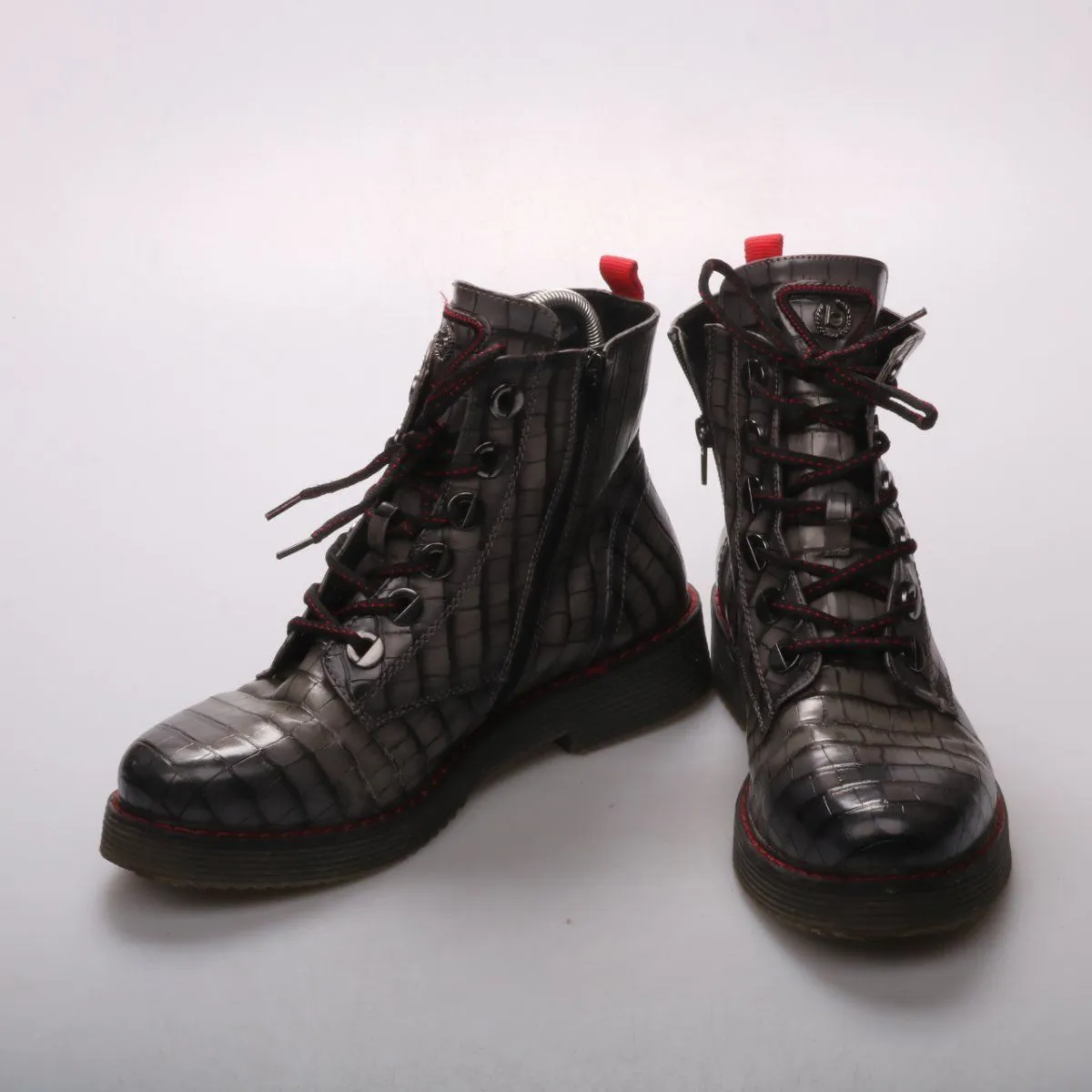 Ботинки Bugatti с тиснением под кроко, шнуровкой и боковой молнией, выполнены в чёрном цвете с контрастной красной отстрочкой. Подойдут для повседневной носки в городе в прохладную погоду. Практичный плюс — молния помогает быстро надевать и снимать обувь, а толстая подошва устойчивее на дороге.