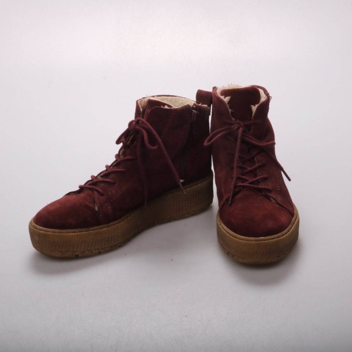 Ботинки Tamaris из замши бордового цвета, со шнуровкой и боковой молнией. Внутри тёплая меховая подкладка, подойдут для повседневной носки в холодную погоду. Толстая рифлёная подошва даёт хорошее сцепление с поверхностью.