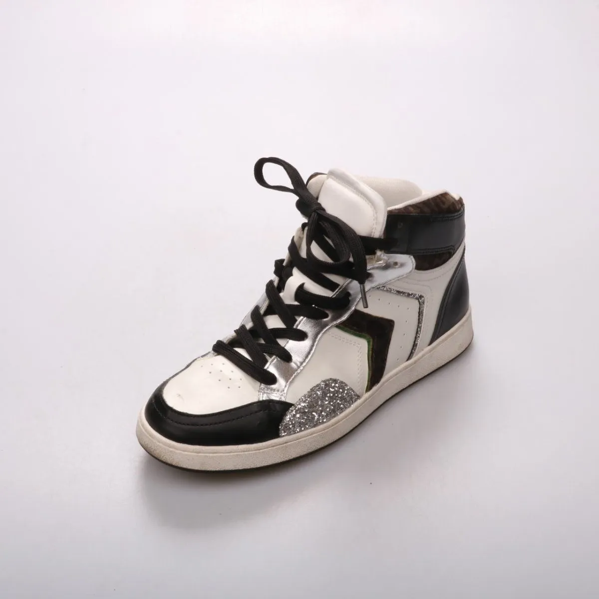 Высокие кроссовки Graceland в чёрно-белой гамме с серебристыми вставками и глиттерным акцентом. Подойдут для повседневных образов в городе в демисезон и прохладное лето. Плотный верх и высокая посадка лучше фиксируют голеностоп, а резиновая подошва даёт устойчивость.