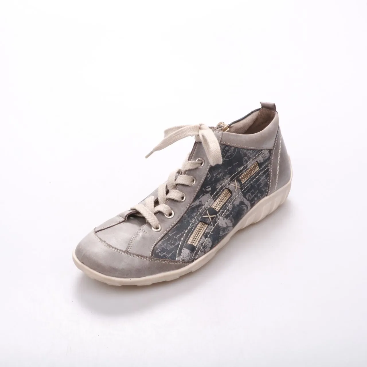 Женские кроссовки Remonte в серо-синей расцветке с принтом, на шнуровке и с боковой молнией. Подойдут для повседневной носки в межсезонье и прохладным летом. Практичное преимущество — молния сбоку позволяет быстро надевать обувь без постоянной перешнур...