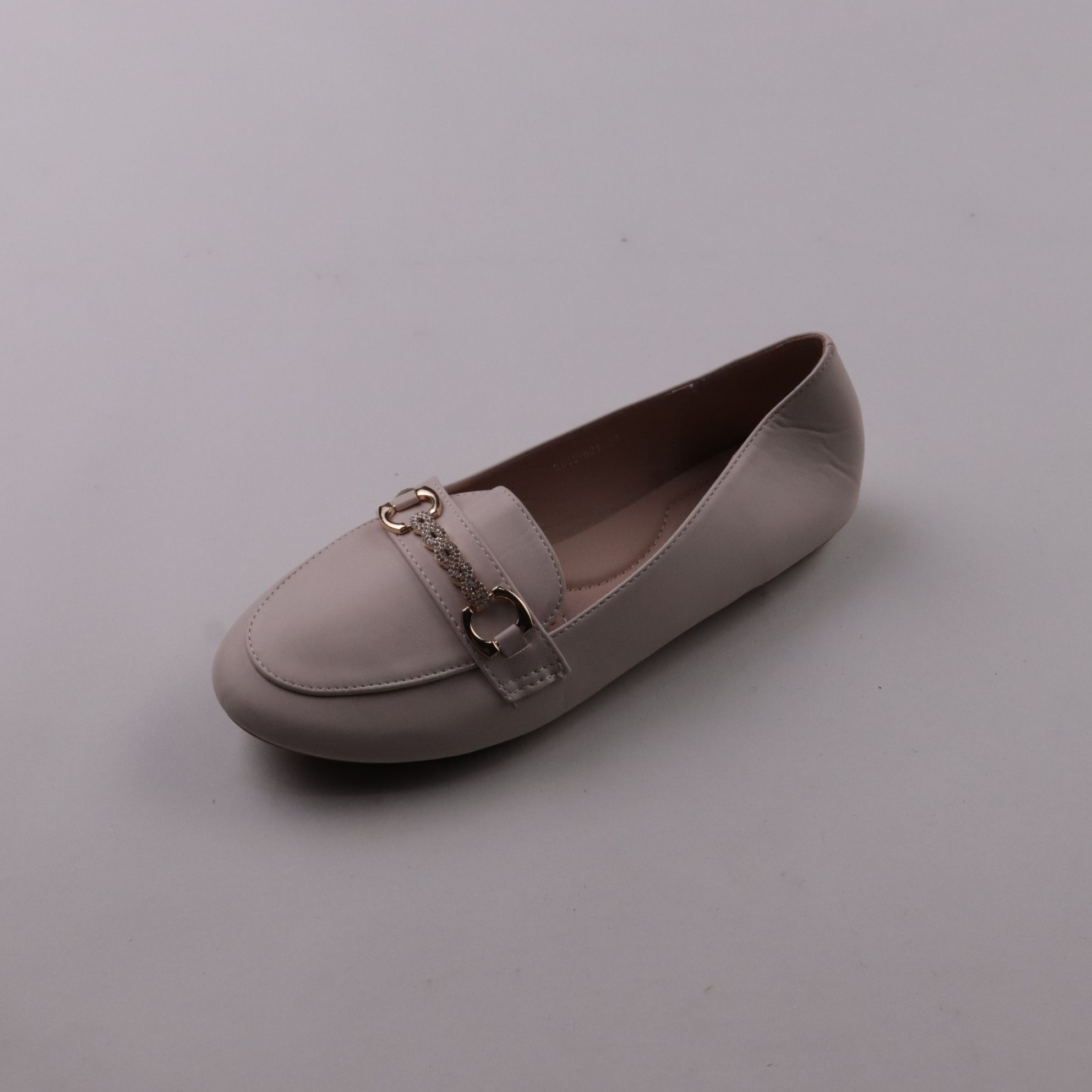Женские лоферы без указания бренда в бежевом цвете, с декоративной цепочкой и металлической фурнитурой. Подойдут для офиса и повседневных образов с брюками, джинсами или юбкой. Мягкий верх и плоская подошва делают их удобными для длительной носки.