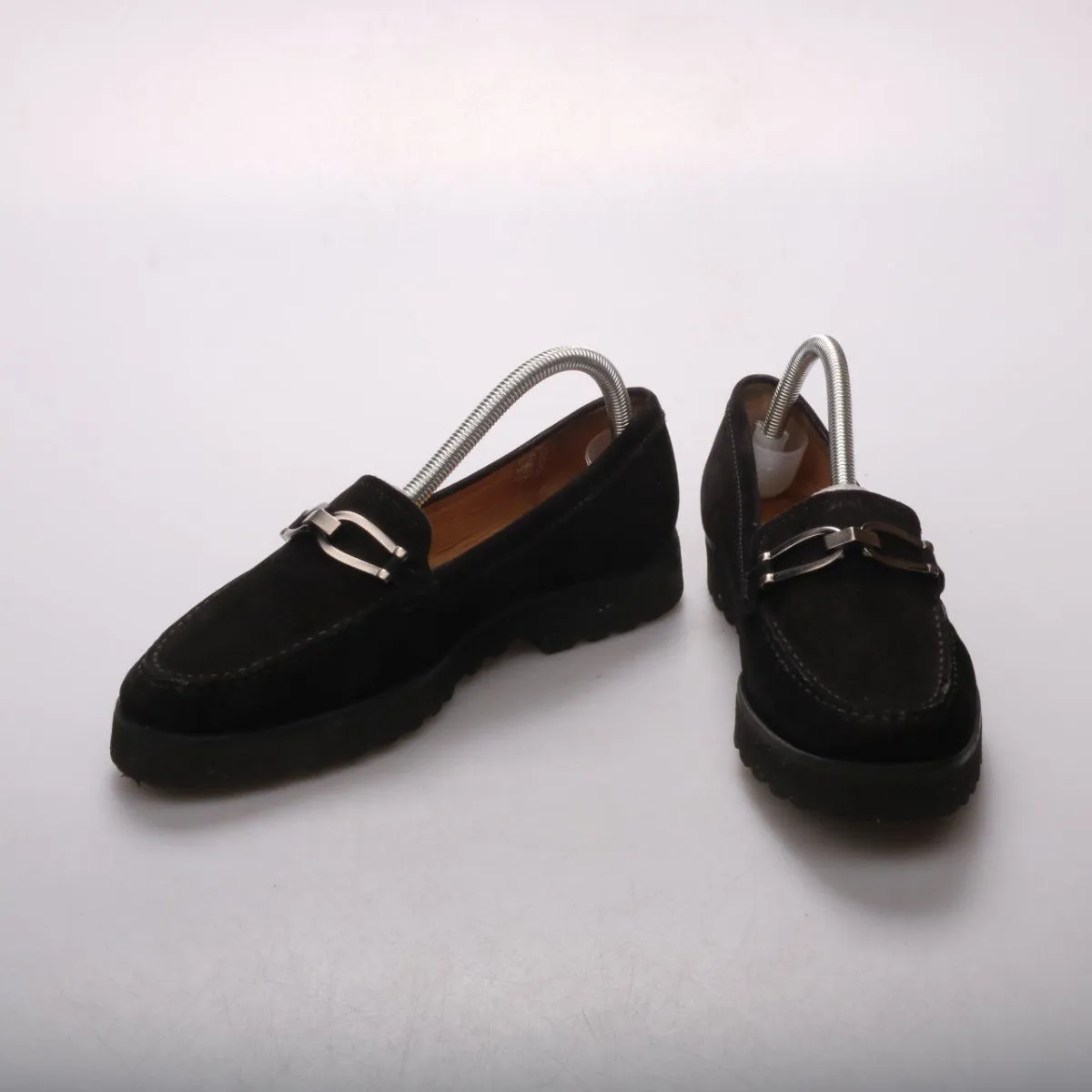Лоферы Wrath из чёрной замши с металлической перемычкой и массивной рифлёной подошвой. Подойдут для повседневной носки и офиса в демисезон. Практичное преимущество — устойчивая подошва с хорошим протектором.
