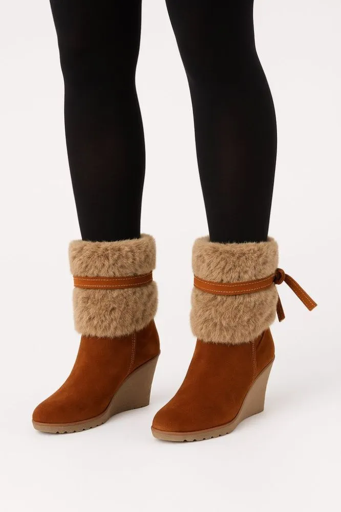 Женские полусапоги из замши с меховой опушкой и завязками, на устойчивой танкетке. Подойдут для зимних прогулок и повседневных образов с джинсами или платьями. Рифлёная подошва даёт лучшее сцепление на скользкой поверхности.