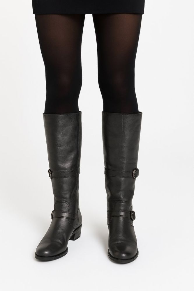 Женские сапоги из натуральной кожи в чёрном цвете, высота до середины икры, с ремешками и декоративными пуговицами. Подойдут для повседневной носки в городе в прохладную погоду, хорошо сочетаются с платьями и джинсами. Устойчивый невысокий каблук и мол...