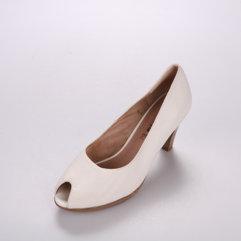 Женские туфли Tamaris молочного цвета с открытым носком и каблуком средней высоты. Подойдут для офиса, торжеств и летних прогулок, легко сочетаются с платьями и брюками. Устойчивая колодка и рифлёная подошва помогают увереннее держаться на разных покры...