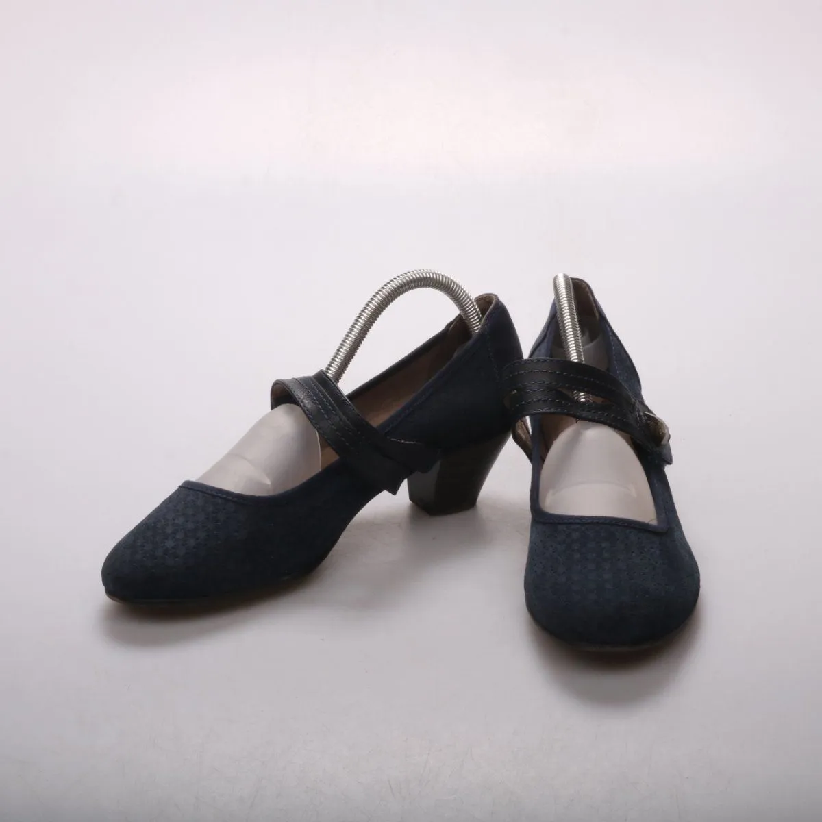 Туфли Jana из замшевого материала тёмно-синего цвета, с ремешком (Mary Jane) и устойчивым каблуком средней высоты. Подойдут для офиса и повседневных выходов в межсезонье и в помещении. Ремешок помогает лучше фиксировать стопу при ходьбе.